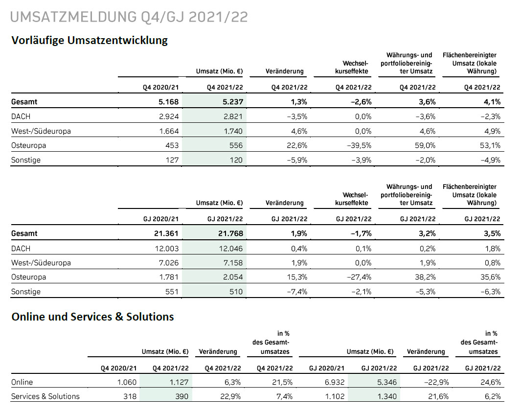 Auch der Umsatz im 4. Quartal 2021/22 konnte mit 3,6% über Vorjahr gesteigert werden, wobei die Online-Umsätze sogar deutlich zulegten. Das bereinigte EBIT für 2021/22 liegt mit rund 200 Mio. EUR im oberen Bereich der Prognose.