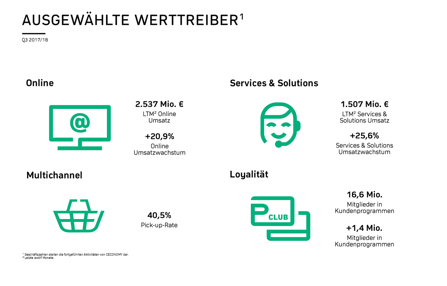 Ceconomy will seine Aktivitäten über das klassische stationäre Geschäft hinaus kontinuierlich ausbauen. So wuchs der Bereich Online/Mobile im dritten Quartal im Vergleich zum Vorjahreszeitraum um 20,9 % und erzielte einen Umsatz von 584 Mio. EUR. Damit beträgt der Online/Mobile-Anteil am Gesamtumsatz mittlerweile 12,7 % (Q3 2016/17: 10,4 %). Nahezu jeder zweite Online-Kunde nutzte die Möglichkeit, online oder mobil bestellte Waren im Markt abzuholen (Q3 2017/18: 40 % vs. 39 % im Vorjahr).