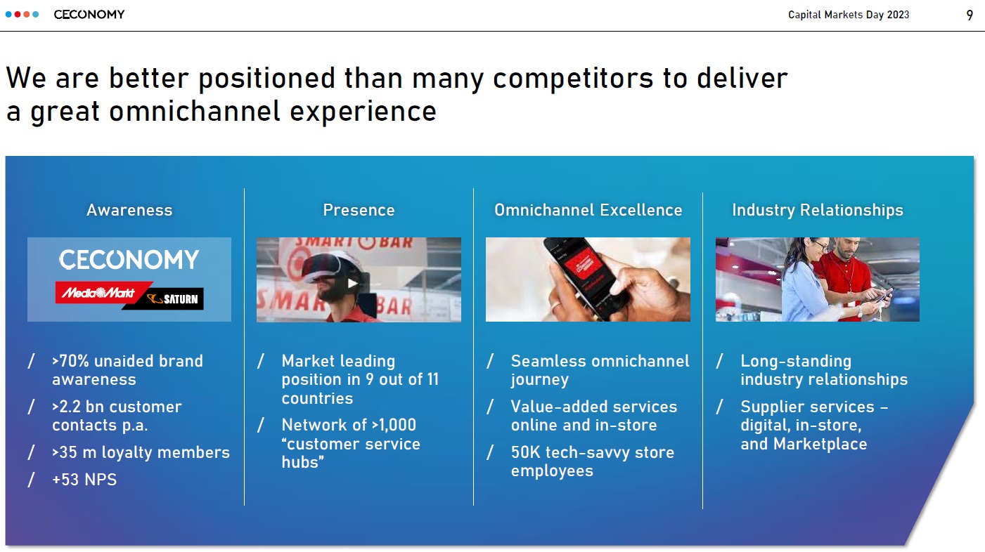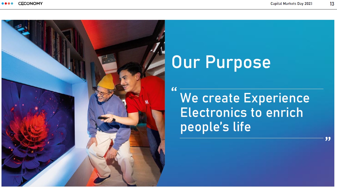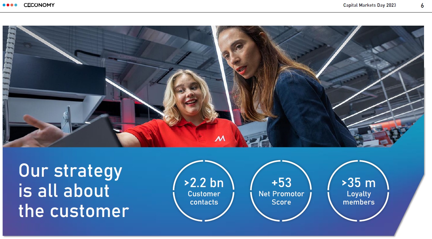 Grundlage der Unternehmensstrategie ist die starke Marktposition von Ceconomy: Das Unternehmen ist der größte Consumer Electronics-Händler in Europa, hat in neun von elf Ländern eine führende Marktposition, verzeichnet über 2 Milliarden Kundenkontakte pro Jahr und verfügt dank der im Jahr 2021 begonnenen umfassenden Unternehmenstransformation inzwischen auch über eine effizienzoptimierte Organisationsstruktur.