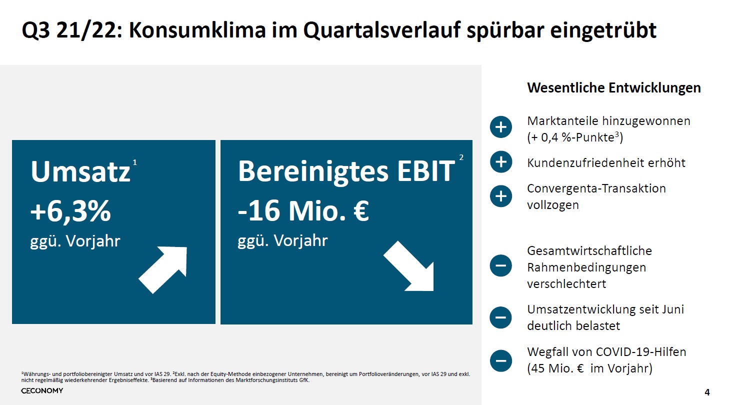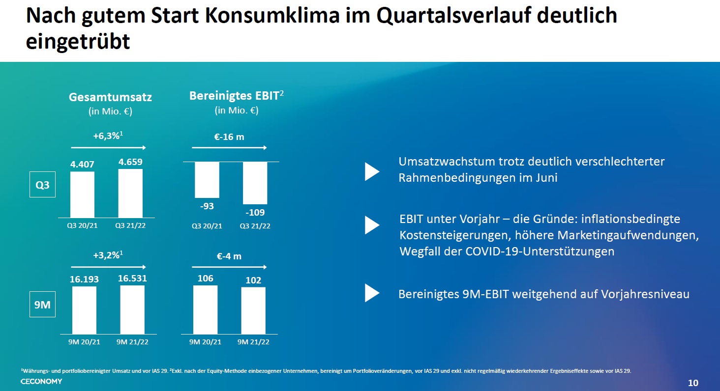 Verbraucherstimmung in den kommenden Monaten auf niedrigem Niveau bewegen wird. Insbesondere im Segment DACH wird die anhaltend hohe Inflation einschließlich stark steigender Energiekosten die Nachfrage beeinträchtigen“, so Florian Wieser, CFO von Ceconomy und MediaMarktSaturn. Und weiter: „Wir sind darauf eingestellt und so solide finanziert, dass wir uns auch in diesem äußerst herausfordernden Umfeld behaupten können.“