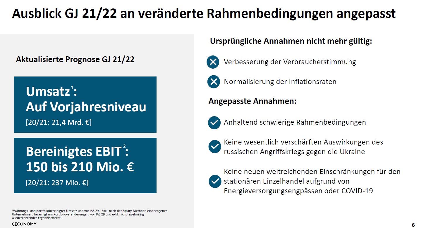 In Anbetracht deutlich veränderter Rahmenbedingungen und des zuletzt stark eingetrübten Konsumklimas hat Ceconomy – wie infoboard.de bereits am 25. Juli berichtet hat – die Prognose für das Gesamtjahr anpassen müssen. Das Unternehmen rechnet aus heutiger Sicht mit einem Umsatz auf dem Niveau des Vorjahres (2020/21: 21,4 Mrd. EUR). Beim EBIT erwartet Ceconomy einen Wert zwischen 150 Mio. EUR und 210 Mio. EUR zu erzielen (2020/21: 237 Mio. EUR9.