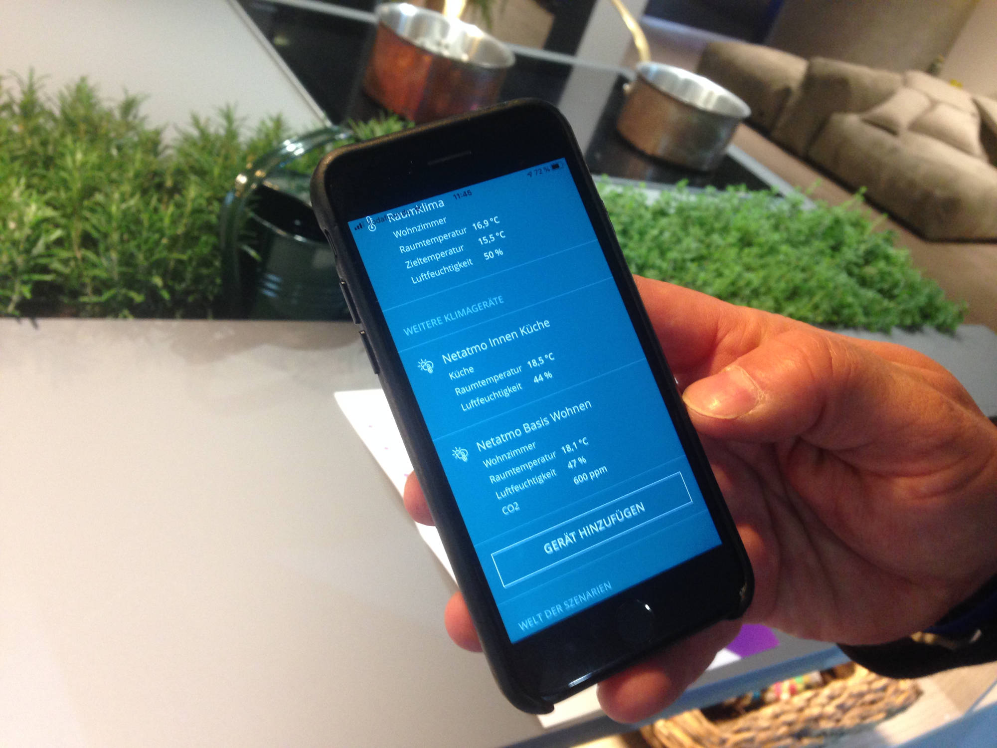 Rekrutiert und kuratiert wurden die smarten Lösungen von Livisi – „die offene und sichere IoT-Plattform” (www.letsbesmart.de). Deren, wenn man so will, Headhunter einerseits, andererseits, quasi, der Lieferant von App-Software. Die sich als deutsch-europäisches Gegengewicht zu den Weltmarktführern USA und China verstehen. Deren Sektor, u.a., das Raumklima, genannt „Wetterstation”. Die einem nicht nur sagt, wann gelüftet werden sollte (und somit gleichfalls über die Luftfeuchtigkeit Auskunft gibt), sondern einem sogar ein Lüften ermöglicht, bei dem sich die Heizung während dessen selbsttätig ausstellt.