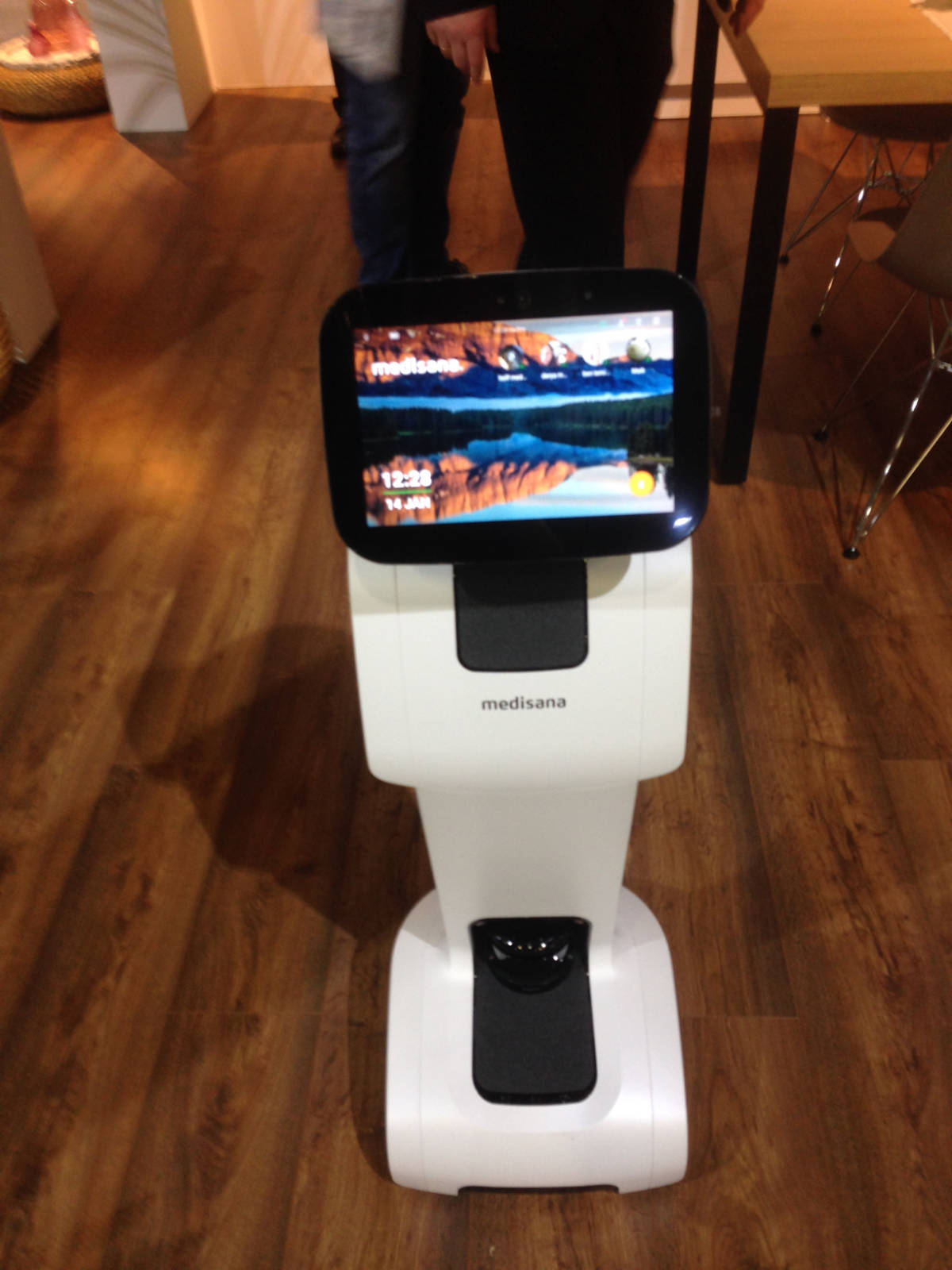 „Was nun ist das Highlight?”, fragt man sich, bevor die „Hausführung“ beginnt. Nur das Licht an- und wieder ausmachen, das kann es ja nicht sein. Vielleicht zeigen, wie der Schrank zu einem kommt? So gesehen in der „Residenz for elderless“. In der es einen fahrbaren, wachhabenden Homecare-Roboter von Medisana gibt, der einen auf Schritt und Tritt verfolgt – kann beruhigen, könnte aber auch nerven – und der „autonom hin- und herfahren kann”. Und dabei selbst am voluminösen Massage-Sessel, die es sogar mit Körper-Scan-Funktion gibt, nicht nachgibt.