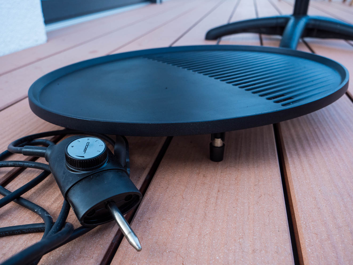 Ebenso einfach funktioniert natürlich auch der Aufbau. Ich habe bei der ersten Inbetriebnahme keine fünf Minuten gebraucht, bis der Barbecue Grill einsatzbereit war. Das elektrische Heizelement, das stolze 2.400 Watt liefert, ist übrigens abnehmbar. Dadurch lässt sich die antihaftbeschichtete Grillplatte komplett entnehmen. Letztere ist in zwei Zonen geteilt: eine glatte Hälfte für “empfindliche” Speise und eine geriffelte für die Röststreifen, die bekanntlich bei keinem Steak vom Grill fehlen sollten.