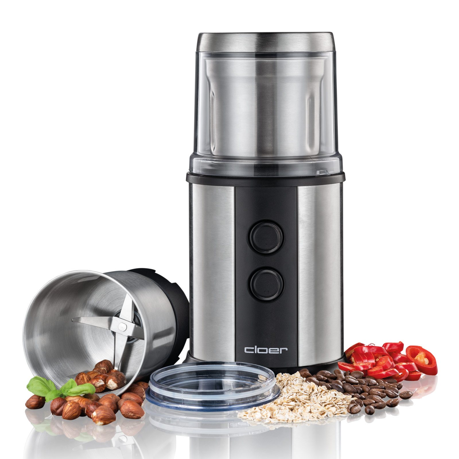 Die Cloer Kaffee- und Gewürzmühle 7419 ist mit zwei Edelstahlbehältern mit Schlagmessern ausgestattet. Das zweiflügelige Messer eignet sich zum Mahlen von trockenen Lebensmitteln. Das vierflügelige Messer ist für die Zerkleinerung von ölhaltigen und feuchten Lebensmittel.