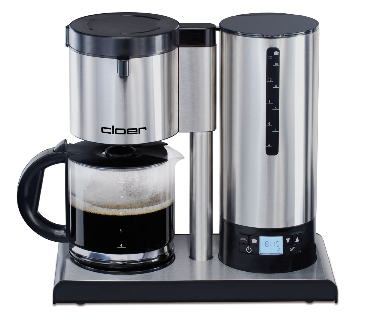Die Cloer Kaffeemaschine 5609 ist eine Filterkaffeemaschine aus hochwertigem Edelstahl. Das Design des Automaten wird durch eine klare Formensprache bestimmt, die durch den Materialmix aus mattiertem Edelstahl und schwarzem Kunststoff betont wird.