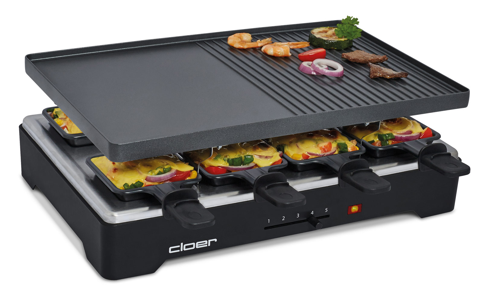 Das Cloer Raclettegrill 6446 bietet acht große Raclette-Pfännchen in denen sich die Speisen gleichmäßig gratinieren oder garen lassen und durch die Antihaftbeschichtung auch einfach wieder entnommen werden können. Die wärmeisolierten Griffe der Pfännchen sorgen dabei für Sicherheit, die kleine Kante am Griff signalisiert das Ende der Isolierung.