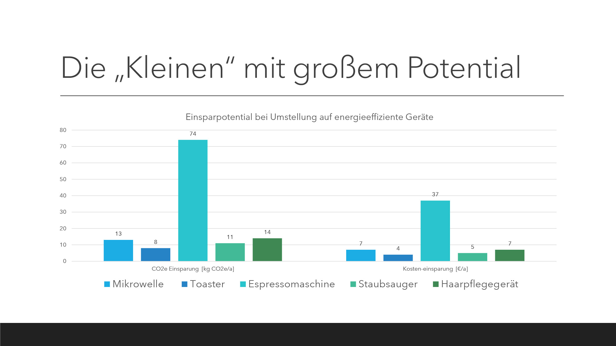 Eine Studie des Öko Institut zeigt zudem, dass innerhalb des privaten Konsums die Elektrokleingeräte ein nicht unerhebliches Einsparpotential von 12 % an Treibhausgasen mitbringen. Gemessen wurde das an fünf exemplarisch ausgewählten Geräten: Mikrowelle, Toaster, Espressomaschine, Staubsauer und Haartrockner. Es zeigt sich, dass auch bei den vermeintlich „Kleinen“ ein großes Potential hinsichtlich der privaten Ökobilanz schlummert.