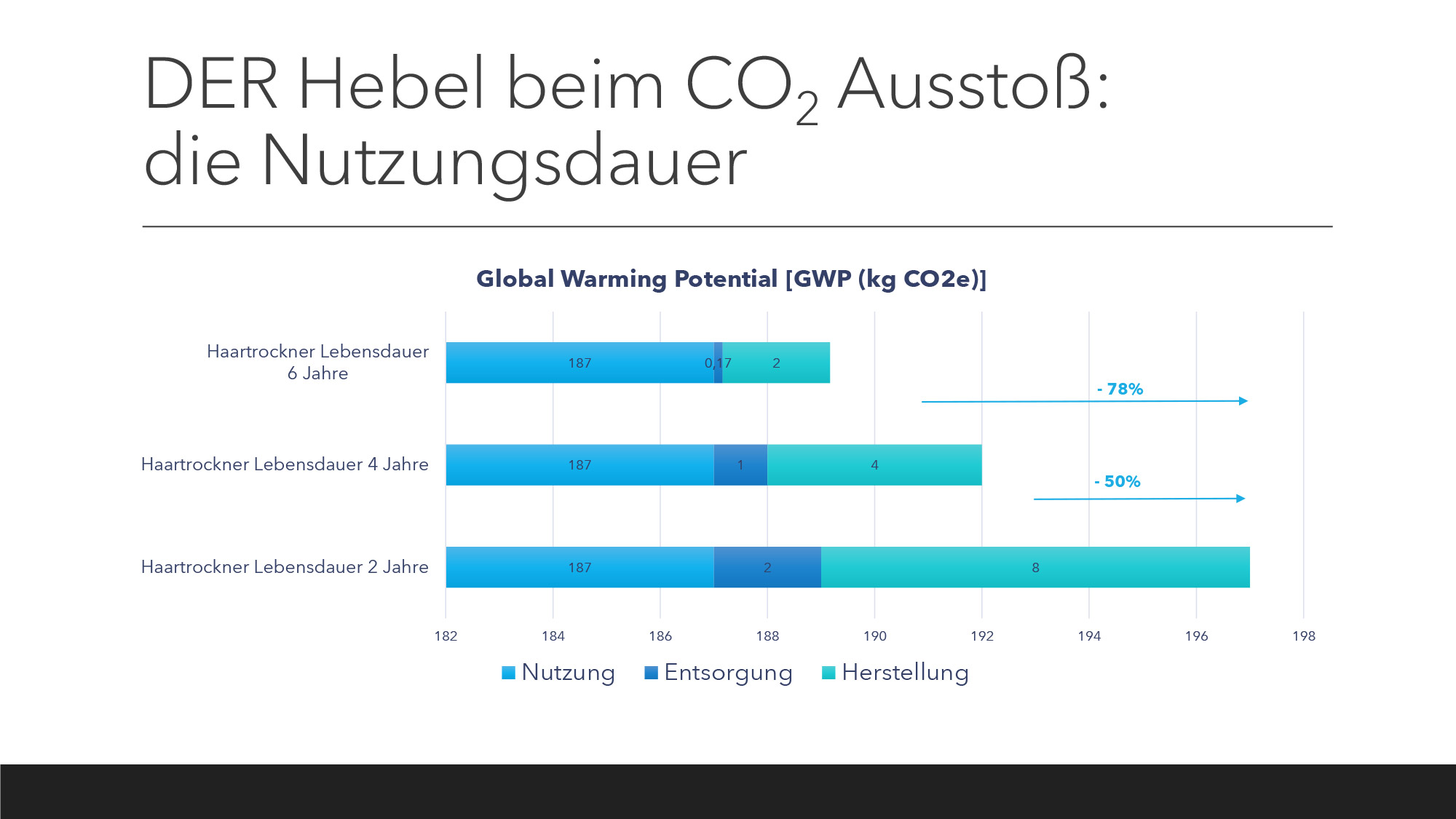 Achte ich beim Kauf eines Neugerätes verstärkt auf die Energieeffizienz des Produktes, kann ich durch meinen bewussten Konsum kurzfristig bis zu 120 kg CO2 pro Jahr einsparen. Klar ist natürlich, dass diese Werte stark vom Nutzerverhalten abhängig sind. Kleingeräte sind ja nicht wie Großgeräte 24 Stunden am Tag im Einsatz. Kommt der Handmixer lediglich zur Weihnachtsbäckerei aus dem Schrank, hat dies andere Umweltauswirkungen als ein Gerät, das von einem ambitionierten Hobbybäcker tagtäglich genutzt wird. Das Einsparpotential als auch der Ressourcenverbrauch kann also stark variieren und sich zudem unterschiedlich auf den Produktlebenszyklus verteilen.