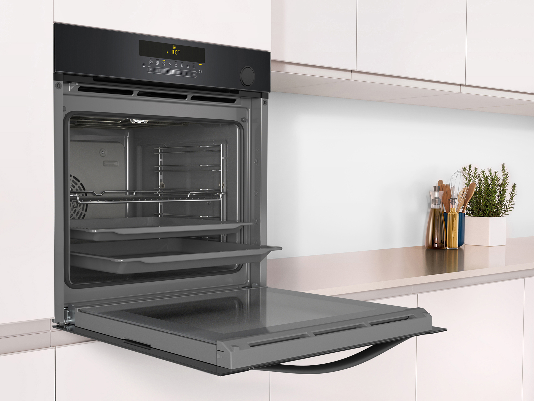 Dafür dient der in der Blende integrierte Wassertank des Backofens. Einmal befüllt, wird eines der 40 Automatikprogramme über die Komfort Scroll Bedienung mit der Dampfunterstützung kombiniert.