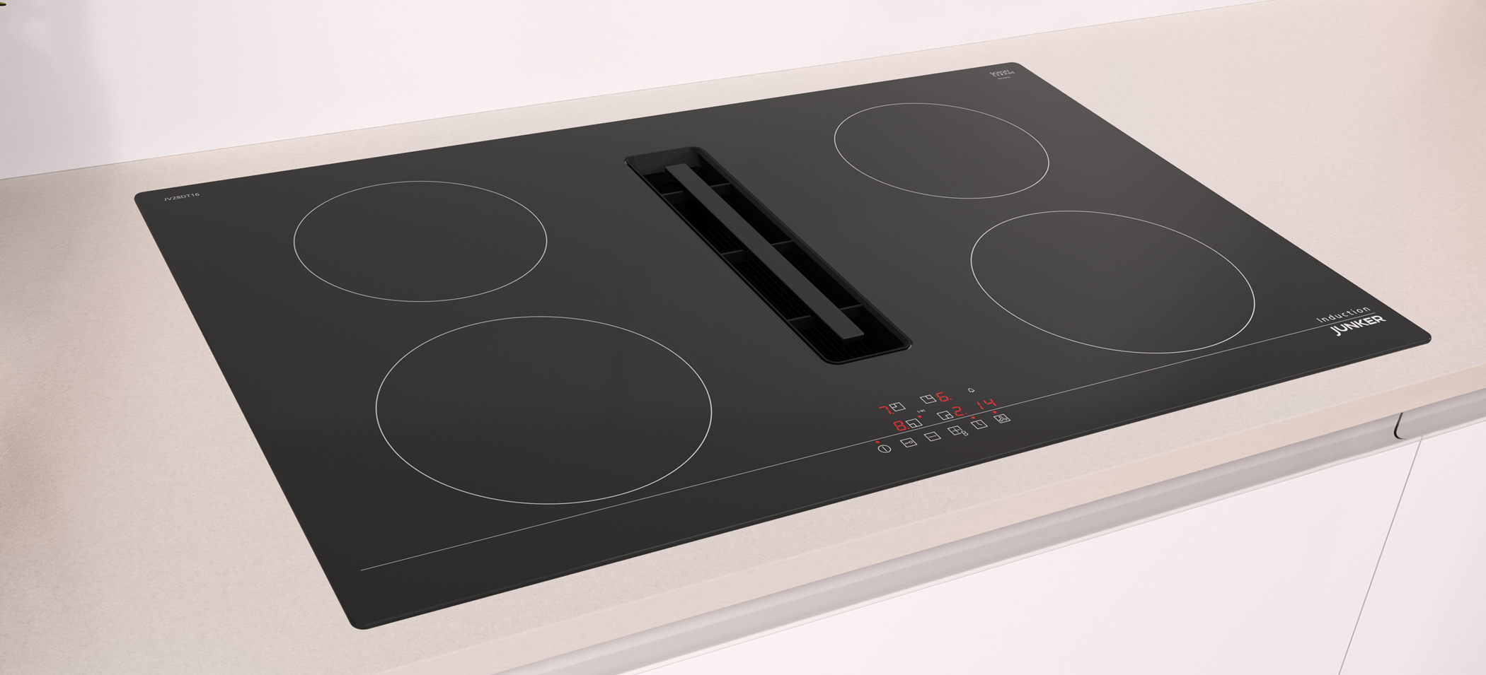 Das Constructa Induktionskochfeld ist ein Einbaugerät mit integriertem Dunstabzug, erhältlich in 60 und 80 cm Breite.