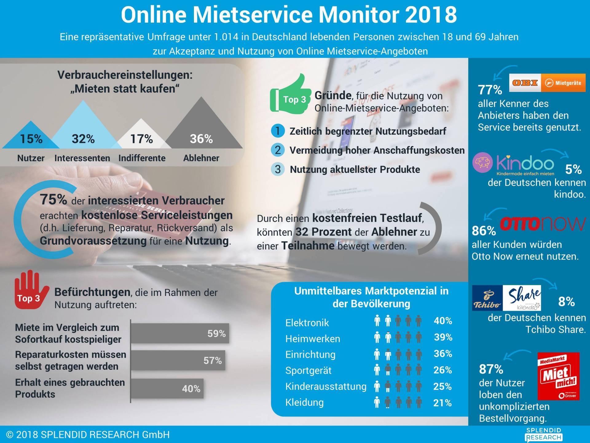 Das Marktforschungsinstitut Splendid Research GmbH, Hamburg, führte im Juli 2018, im Rahmen der Studie „Online Mietservice Monitor“, eine Online-Befragung an insgesamt 1.014 Menschen im Alter von 18 bis 69 Jahren durch. Die Studie soll Handelsunternehmen erstmals valide Verbraucherdaten zum Thema Mieten geben. Sie zeigt auf, wo noch ungenutzte Potenziale liegen und wie Firmen ganz konkret neue Kunden für ihren Online Mietservice erreichen können. OBI, Media Markt, Otto und Tchibo (auch Miele. Anm. der Red.) machen’s bereits vor, Produkte an Ihre Kundschaft zunächst nur zur Miete anzubieten, allerdings in der Regel mit der Option des Kaufes.