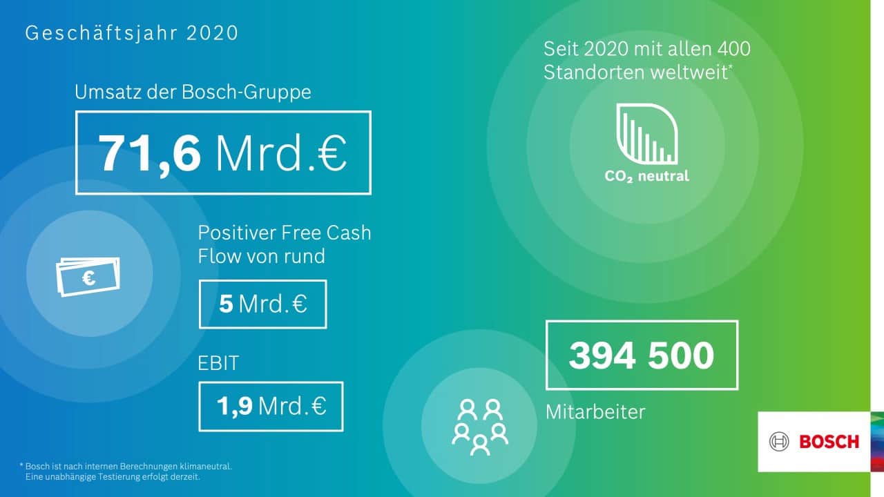 Im Geschäftsjahr 2020 erzielte die Bosch-Gruppe trotz Corona-Krise und rückläufiger Automobilproduktion ein positives Ergebnis. Das Geschäft entwickelte sich damit besser als erwartet. Nach vorläufigen Zahlen erreichte das Ergebnis vor Finanzergebnis und Steuern (EBIT) rund 1,9 Mrd. EUR. Der Gesamtumsatz belief sich auf 71,6 Mrd. EUR und lag damit wechselkursbereinigt 4,4% unter Vorjahr.