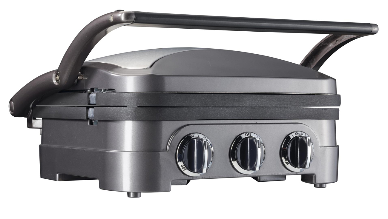 Das Gerät verfügt über zwei Thermostate: eines für den Betrieb bei offenem Gerät mit sechs Stufen, eines für den Betrieb bei geschlossenem Gerät mit fünf Stufen. Eine gleichmäßige Wärmeverteilung ist damit garantiert. Die Ausstattung umschließt wendbare, spülmaschinengeeignete Alu-Grillplatten mit einer Gesamtfläche von 667 Quadratzentimeter (geschlossen), fünf Grillfunktionen, ein höhenverstellbares Scharnier, ein Temperaturspektrum von 100 bis 200 bzw. 230 Grad Celsius (offen) sowie einen Auffangbehälter für Garflüssigkeit.