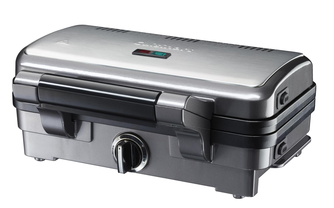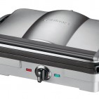Der Cuisinart Grill Griddler Party GR10E hat ein Gehäuse aus gebürstetem Edelstahl und 1000 Watt Leistung. Zur Ausstattung gehört ein Thermostat mit drei Einstellungen (High/ Med/ Low). Das Gerät bietet gegossene, spülmaschinenfeste 8,5 x 15 Zentimeter große Aluplatten für Toast, Sandwiches und Waffeln. Der Griff ist verschließbar. Das Kabel verschwindet in einer Aufbewahrungsvorrichtung.
