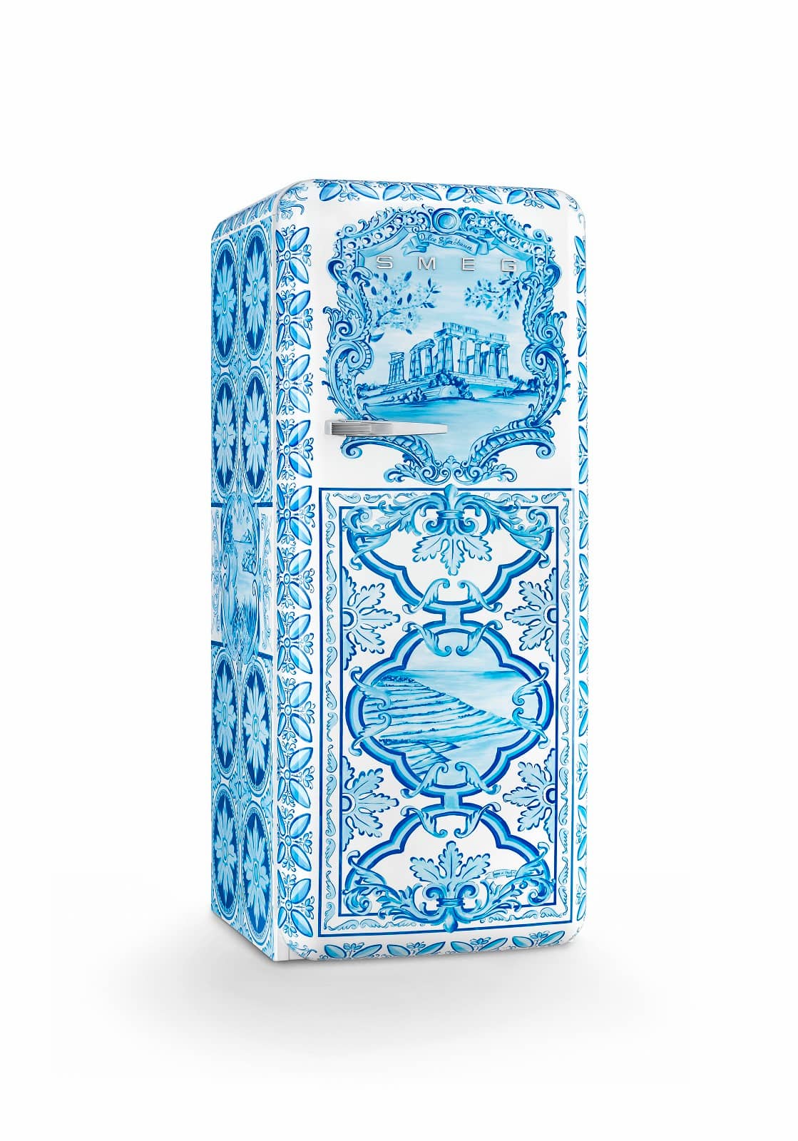 Schlichtes Blau auf weißem Grund. Mehr braucht es nicht, um den Zauber der italienischen Mittelmeerinsel einzufangen – und ihrer reichen Geschichte. Auf der Kühlschranktür zieht die Zeichnung eines griechischen Tempels den Blick auf sich. Die kunstvolle Arbeit im Majolika-Stil ist umrahmt von stilisierten Lilien. Die linke Seite des Geräts schmücken eine fein ausgearbeitete Küstenlandschaft und die für Sizilien so typischen Akanthusblätter. Auf der rechten Seite schlägt ein Blick auf den Geburtsort des Schriftstellers Luigi Pirandello eine Brücke in die Neuzeit. Eine Liebeserklärung von Smeg an die italienische Heimat.