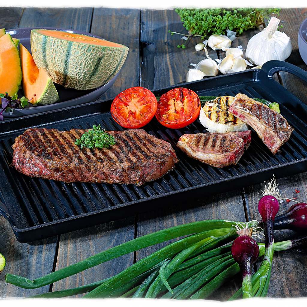 Wer es noch ein wenig individueller mag – zum Beispiel die Krabben mit Knoblauch zubereiten oder für den veganen Partner eine absolut fleischfreie Grillzone schaffen – der greift zu den Grill-und Servierpfannen von Küchenprofi. Die sind aus Gusseisen, können auch in den Backofen oder auf den Herd (denn leider ist jede Grillsaison einmal vorbei) und kommen dann direkt auf den Tisch. Keine Sorge: die Tischfläche bekommt keine Brandflecken – ein Untersetzer aus Pinienholz wird mitgeliefert.