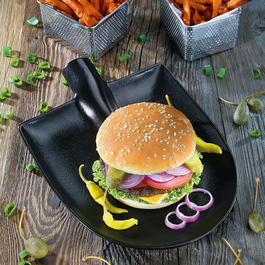 Man kann Steaks und Burger natürlich auf einem Porzellanteller servieren. Viel cooler ist es aber, dafür eine Schaufel zu nehmen. Natürlich keine richtige, sondern eine aus Keramik. Oder Servierpfännchen aus Gusseisen für die kleinen Naschereien.