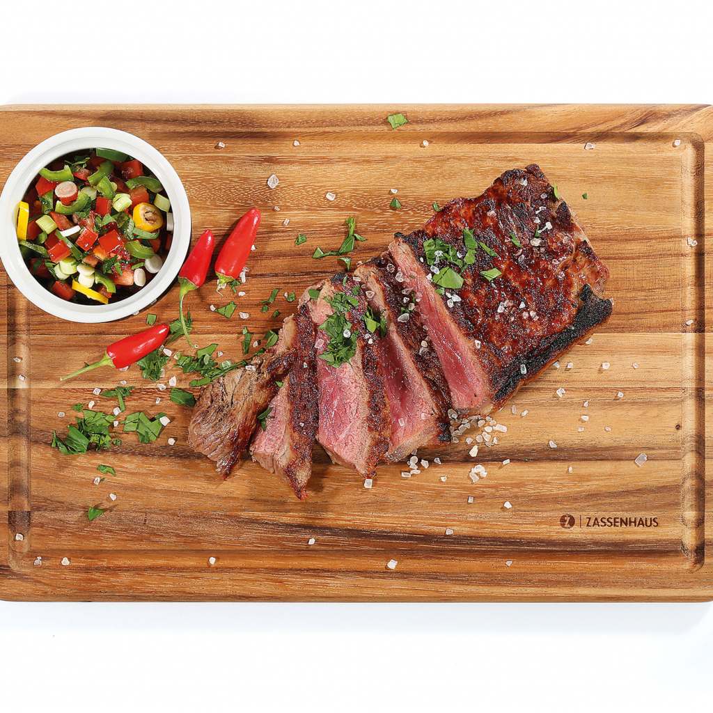 Oder warum nicht einmal vom Holzbrett essen? Das hier ist aus Akazie – dieses Holz zeigt nicht nur eine schöne honigfarbene Tönung, sondern ist noch dazu besonders schnittfest. Das Steakbrett von Zassenhaus ist 36 x 23 Zentimeter groß, damit auch ideal für richtige große Teile, wie beispielsweise ein T-Bone-Steak.