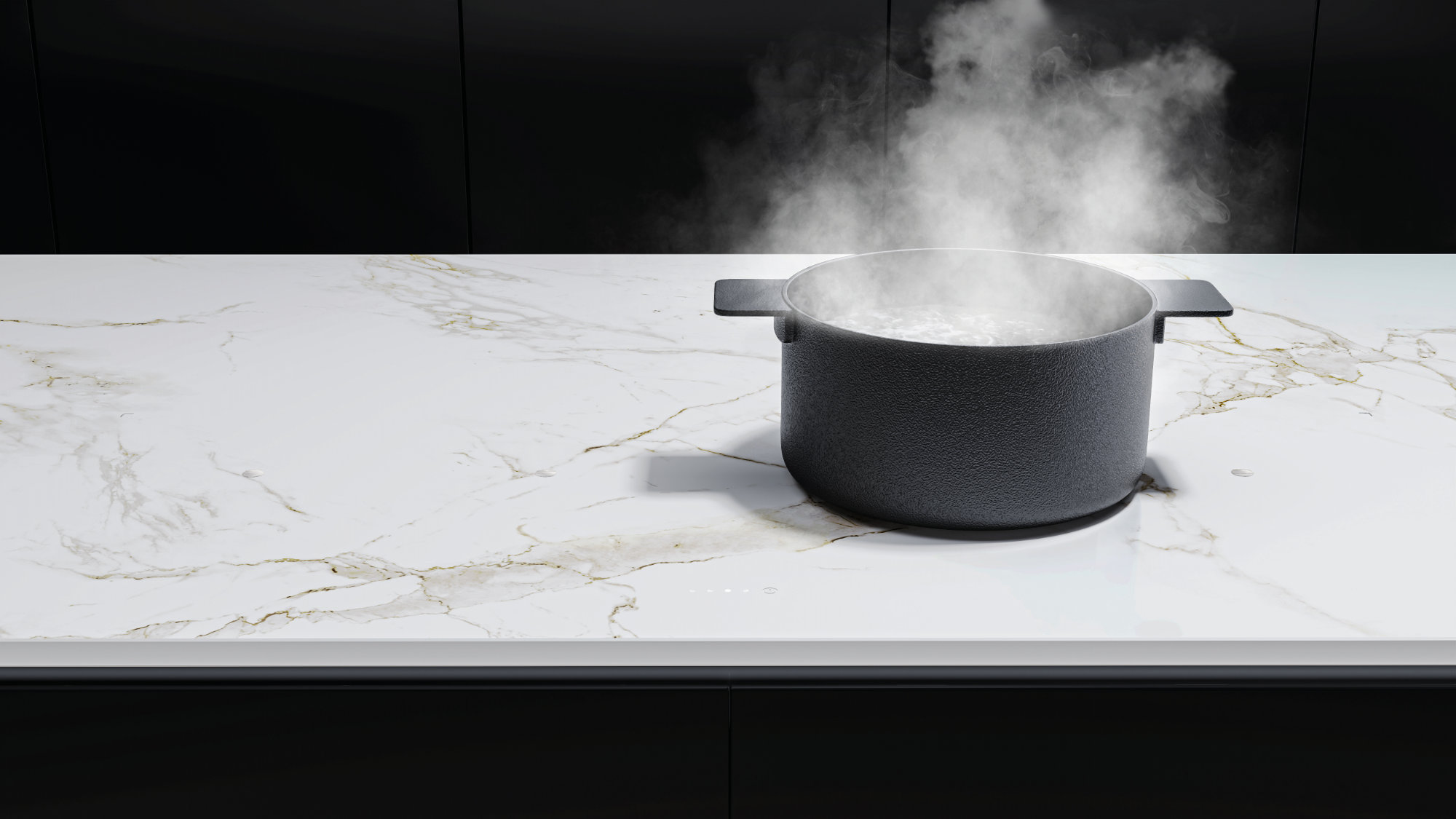 Die herkömmliche Glasabdeckung ist verschwunden, stattdessen wird direkt auf der Arbeitsplatte gekocht, unter der sich die hochwertige Induktionstechnologie befindet. Nur dezente Gravuren, die minimalistischen Centerpoints und die LED-Anzeigen verraten die Funktion und definieren die Kochzonen.