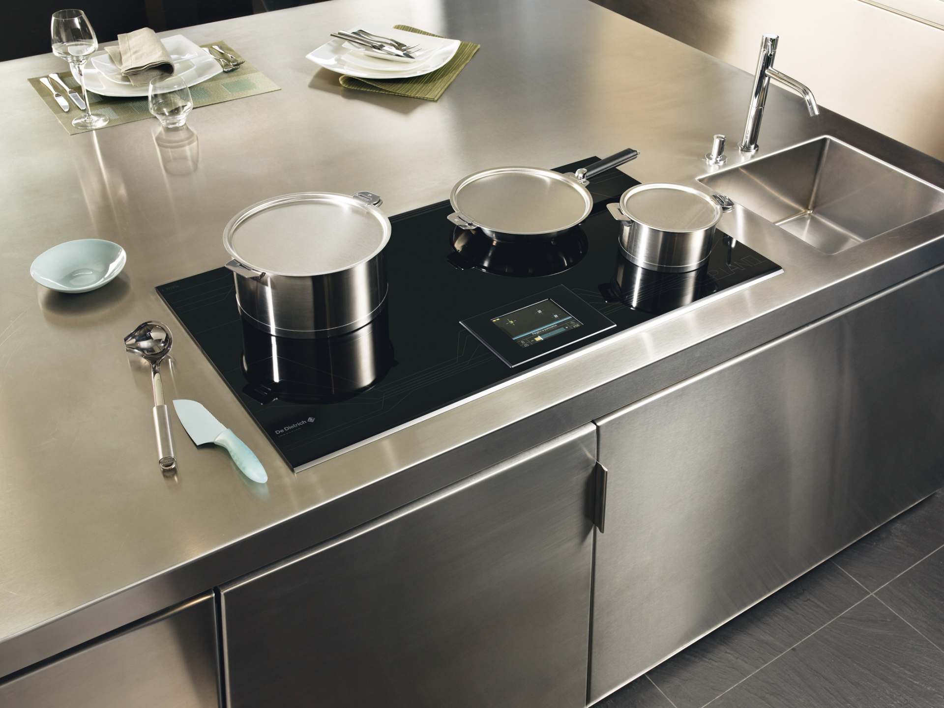 Die schwarze Glaskeramik-Oberfläche des De Dietrich DTIM-1000C Piano Induktionskochfeld im zeitlosen Edelstahl Stratos-Rahmen und das frontseitige Sensor-Touch-Bedienelement zeigt nach dem Einschalten, was heute Induktion bieten kann.