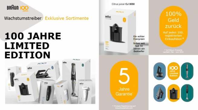 Braun konnte im vergangenen Jahr durch Wachstum im Stabmixer-Bereich überzeugen, hat aber, so Harring, noch Luft nach oben. 2021 steht bei Braun alles im Zeichen des 100-jährigen Firmenjubiläums: Im Rahmen einer großangelegten Mediakampagne zum Geburtstag (zusammen mit P&G) sollen stylishe Sondermodelle der beliebtesten Evergreens und eine „5 Jahre Garantie“ für attraktive Kaufanreize sorgen. Harring abschließend: „Die Mannschaft ist hungrig. Wir sind ein verlässlicher Partner für den Handel mit guten Marken.“