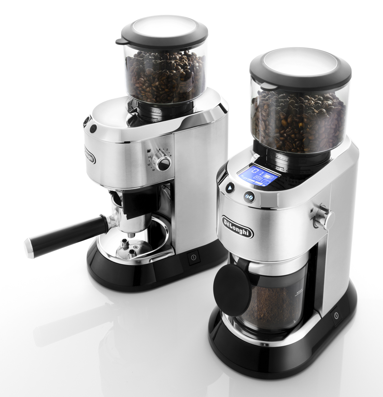 Das Design der Kaffeemühle ist den hochwertigen Dedica Siebträgermaschinen von De’Longhi nachempfunden. Ein typisches Merkmal der eleganten Serie ist das formschöne Aluminiumgehäuse mit seinen abgewinkelten Kanten. Einzelne verchromte Elemente wechseln sich mit zeitlosem Aluminium ab und setzen so elegante Akzente. Ein schwarz lackierter Kunststofffuß bildet den Kontrast und sorgt für die nötige Standfestigkeit.