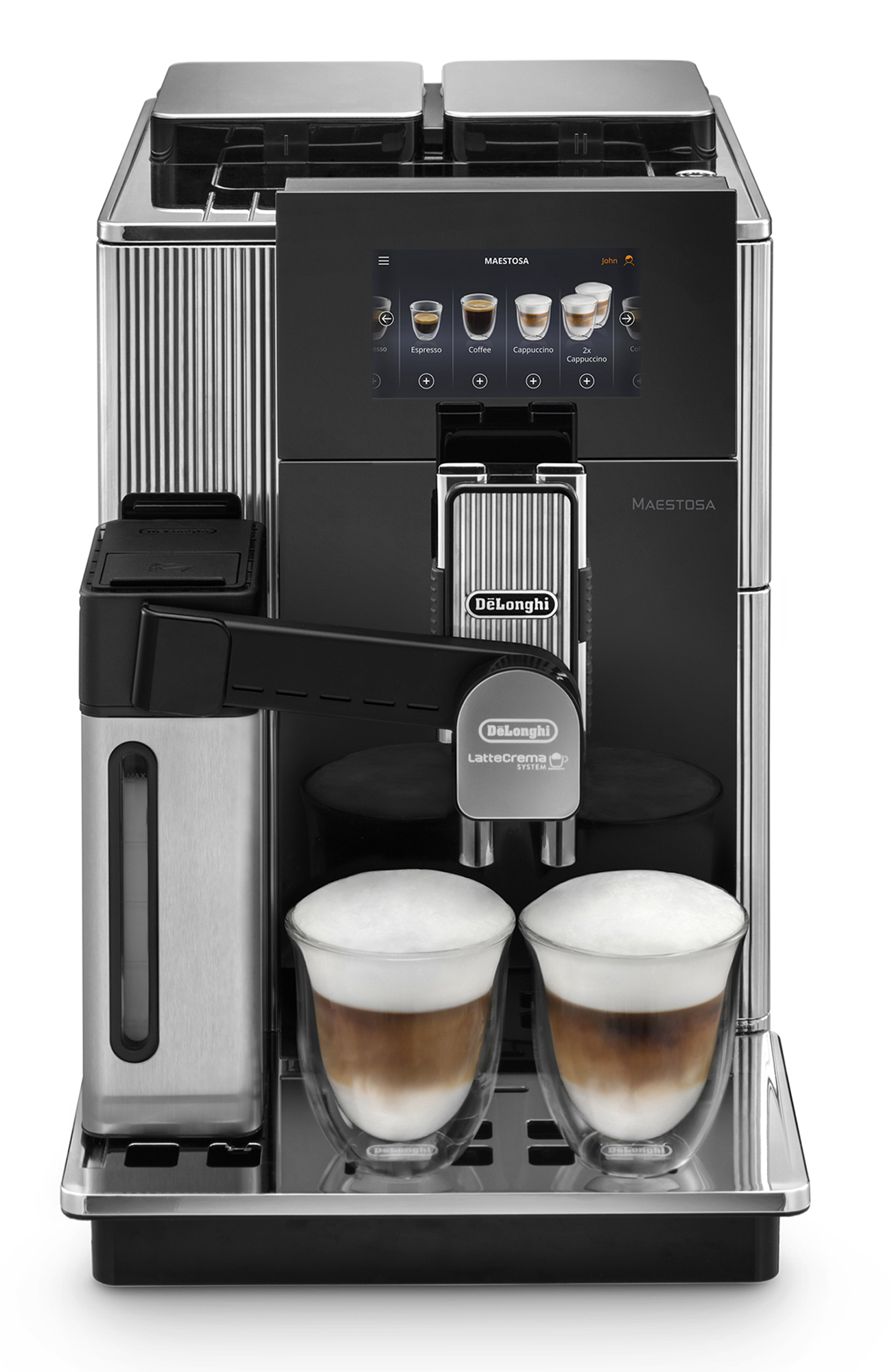 Der De´Longhi Kaffeevollautomat Maestosa bietet Italienisches Design pur: Eine schlichte, hochglanzpolierte Front aus edlem Glas wird an den Seiten von hochwertigem, wellenförmig gestanztem Edelstahl im „Stripe Design“ umrahmt.