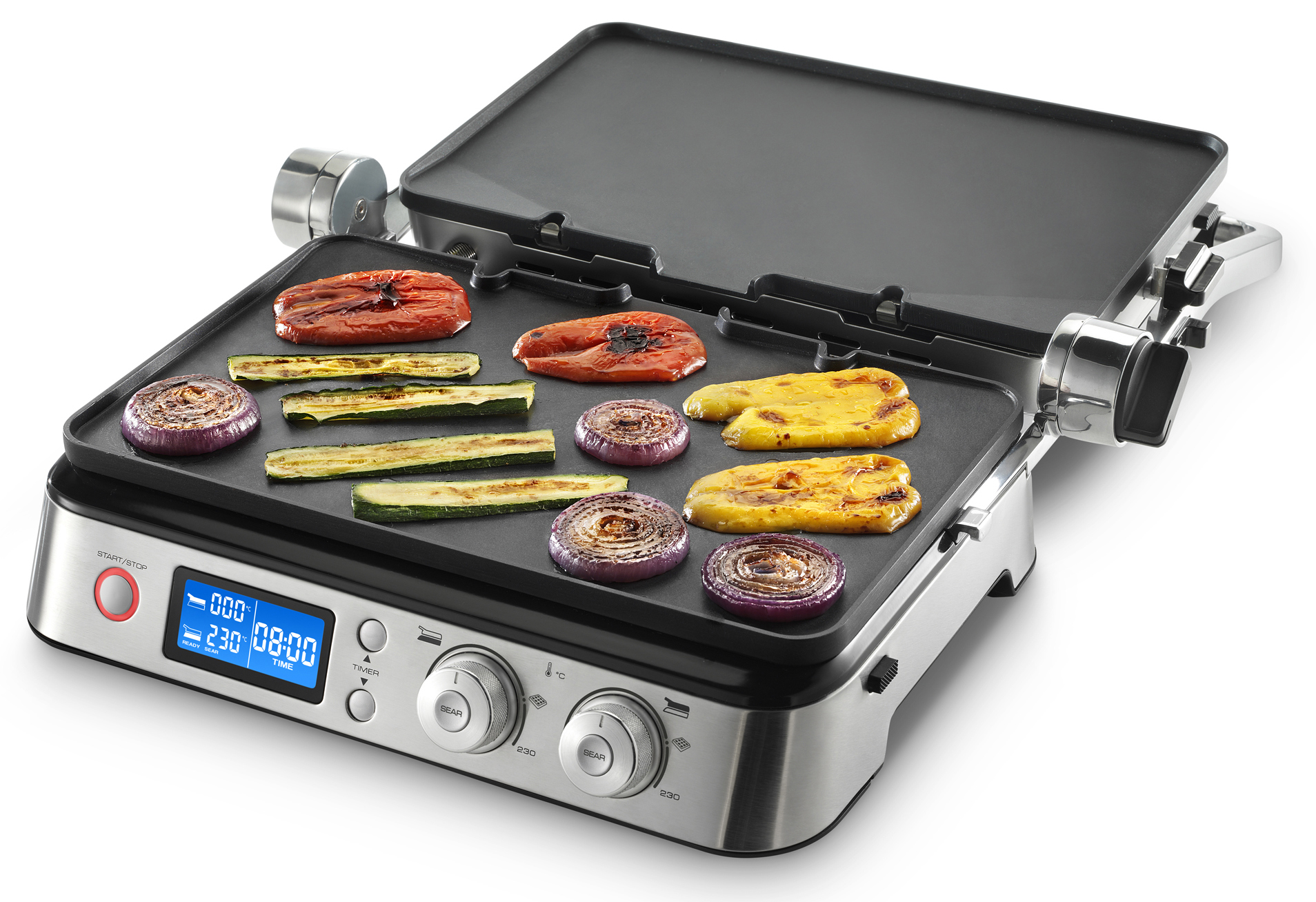 Sieben verschiedene Funktionseinstellungen garantieren abwechslungsreiche Leckereien zu jeder Jahreszeit. Der Kontaktgrill mit abnehmbaren geriffelten oder glatten Platten und einer Nutzfläche von 37 cm x 23 cm grillt Hamburger, Koteletts, Hühnchen oder einfach nur Sandwiches. Die glatten Platten funktionieren wie ein „heißer Stein“ und ermöglichen vielseitige Grillvariationen. Mit der „Sear“-Funktion ist extrascharfes Anbraten für alle Sorten Fleisch möglich, die höhenverstellbare Gratin-Funktion sorgt für einen knusprig-krossen Boden und zart geschmolzenen Käse on top. Mithilfe der Waffeleisen gelingen knusprig-luftige Waffelkreationen in Sekundenschnelle.