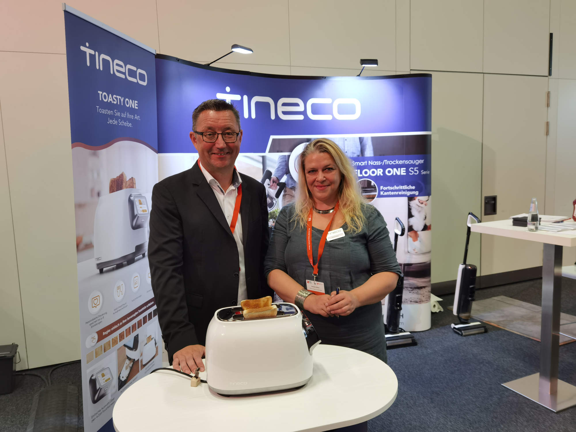 Eine Innovation vom Bodenpflege-Spezialisten Tineco ist ein Toaster. Auf unserem Foto: Marco Getz (General Manager) und Sandra Kittner (Marketing Manager).