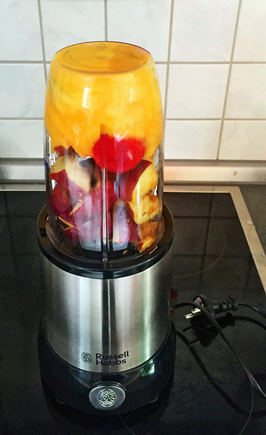 So ein „Multi Blender“, wie ihn der Hersteller nennt, braucht Gegner. Er soll zeigen, was er kann. Deswegen ist jede Menge Obst im Haus. Mango, Banane, Orange, Apfel, Erdbeere, Weintraube, Pfirsich und Nektarine. Diese Monatsration an gesunder Ernährung wird jetzt verflüssigt.