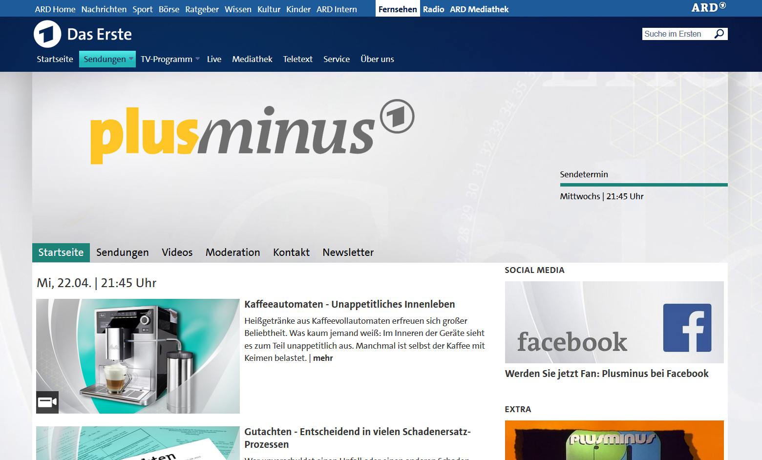 Da hatten selbst wir den Kaffee auf! Vergangenen Dienstagabend berichtete das ARD-Wirtschaftsmagazin „plusminus“ zur besten Sendezeit über einen vom SWR produzierten Kaffee-Vollautomaten-Test. Schon der reißerrische Teaser auf der Homepage des Senders ließ uns Schlimmes ahnen: „Plusminus hat zusammen mit Experten zufällig ausgewählte Vollautomaten untersucht. Alle Maschinen waren schon länger im Gebrauch Das Ergebnis schockierend: Keime, Bakterien, Hefe- und Schimmelpilze. Und die können zu gesundheitlichen Problemen führen.“
