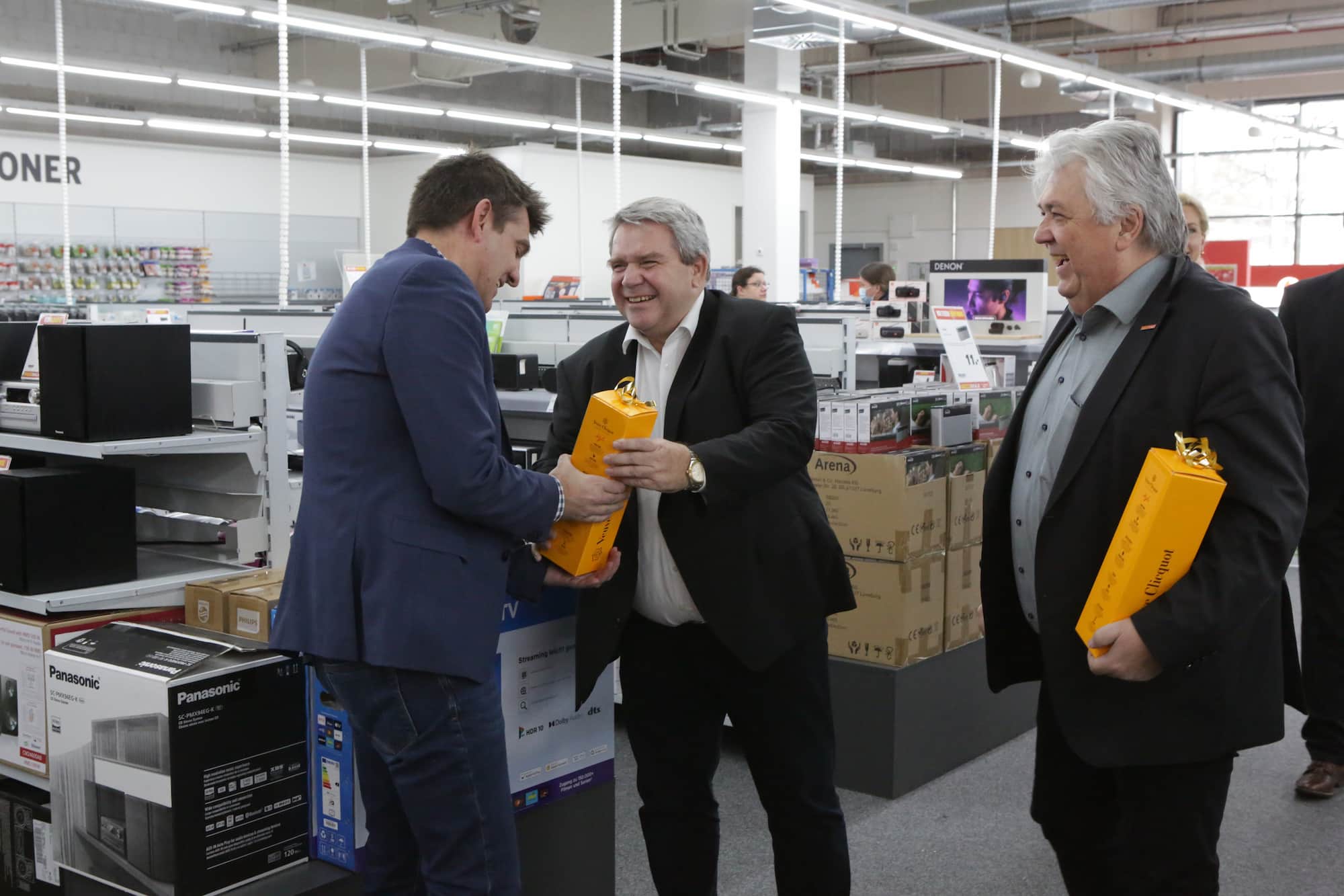 Ralf Gassner (l.) freut sich über die Glückwünsche von ElectronicPartner Vorstand Friedrich Sobol (M.) und Torsten Schimkowiak (r.), Leiter Vertrieb ElectronicPartner. Fotos ElectronicPartner
