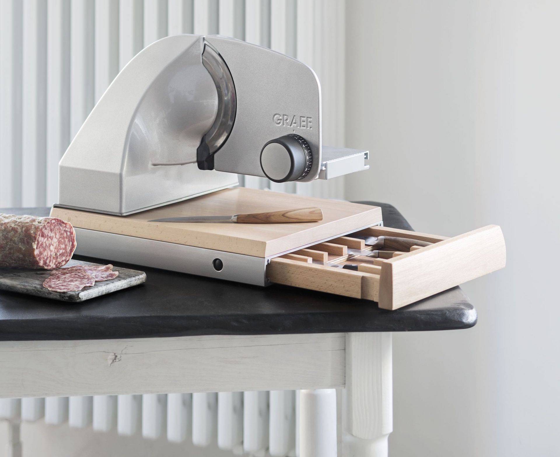 Professionalität, gepaart mit überzeugendem Design, das strahlt der SKS 850 von Graef aus. Das neueste Modell besteht aus einem Premium-Allesschneider und einem edlen Buchenholz-Schneidbrett, in das eine Messerschublade kindersicher integriert ist. So lassen sich alle Schneidwerkzeuge zentral und platzsparend unterbringen. Und ein schicker Blickfang ist dieser schneidige Mittelpunkt der guten Küche obendrein.