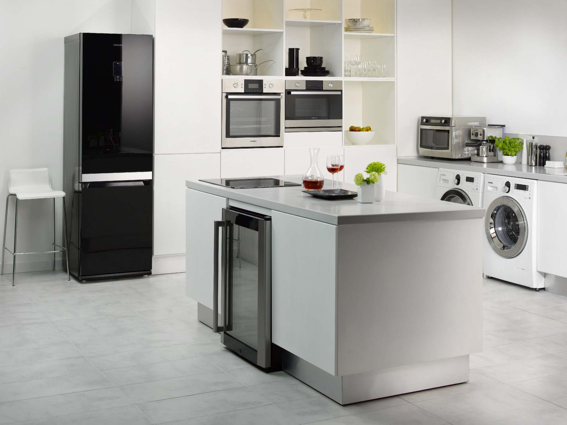 Trendige weiße, creme- oder pastellfarbene Küchen können Designfans alternativ auch mit einem intensiven Farbkontrast kombinieren, um aufmerksamkeitsstarke Akzente zu setzen. Zum stilvollen Blickfang wird beispielsweise Samsungs RL-55VTEBG. Mit ihrer ebenmäßigen schwarzen Glas-Front legt die Kühl-Gefrier-Kombination einen eleganten Auftritt hin. Einen zusätzlichen Effekt erzielen Nutzer auf Wunsch mit der blauen LED-Beleuchtung zwischen Kühl- und Gefrierbereich.