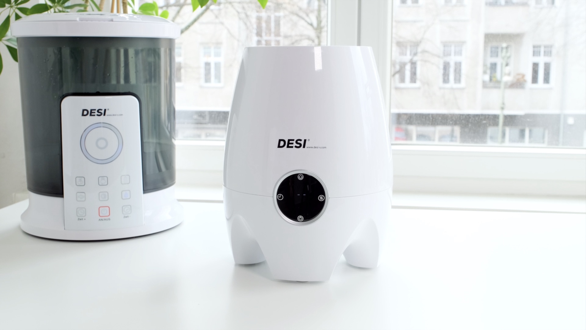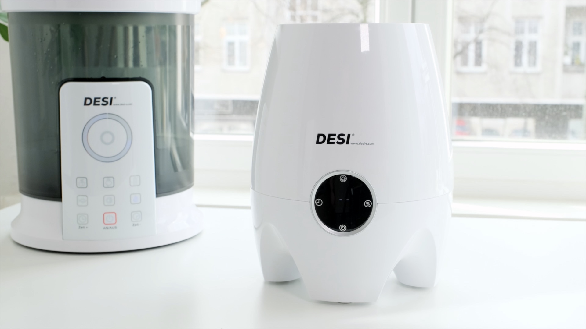 Beim DESI Mini-Jet handelt es sich um ein Kaltvernebelungssystem für Räume mit einem Volumen von bis zu 15 Kubikmetern. Dieses arbeitet einerseits als Luftbefeuchter, der in drei Leistungsstufen die Luftfeuchtigkeit konstant zwischen 45-90% zu halten vermag. Der gewünschte Wert ist sowohl direkt am Gerät als auch über die im Lieferumfang enthaltene Infrarotfernbedienung einstellbar.