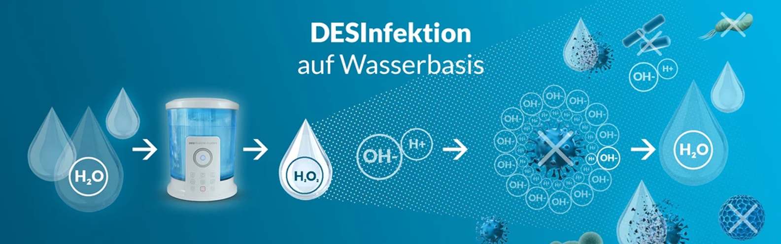 Der DESI Plasma-Fluider bereitet das Wasser per Knopfdruck auf. Dabei werden die Wassermoleküle plasmatisiert und es entstehen Hydroxylradikale. Diese stürzen sich auf die Bakterien bzw. Viren und brechen deren Fett-Hülle auf. Die Mikroorganismen trocknen aus, stellen die Reproduktion ein und sterben.