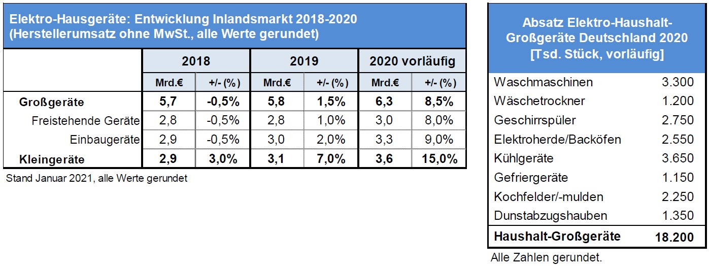 Haushalt-Großgeräte kamen auf einen Anteil von rund 6,3 Mrd. EUR (+ 9%), wobei alle Produktgruppen Zuwächse verzeichnen konnten. Besonders stark nachgefragt waren Gefriergeräte (+ 40%), große Kühl-/Gefrierkombinationen, Einbaubacköfen, Induktionskochfelder und Waschtrockner. Insgesamt wurden 2020 in Deutschland etwa 18,2 Millionen Haushalt-Großgeräte verkauft.