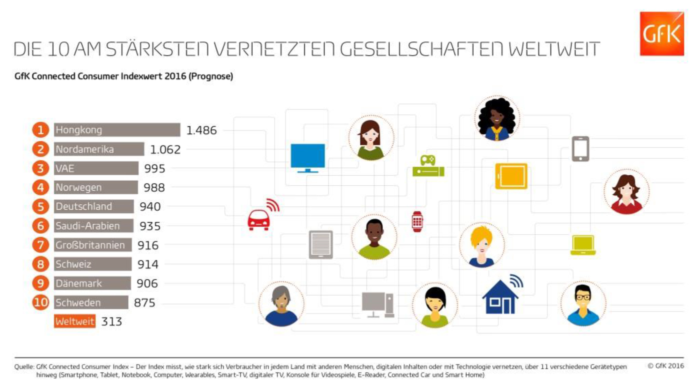 In den beiden letzten Jahren lebten laut GfK Connected Consumer Index die am stärksten vernetzten Verbraucher in Hongkong und Nordamerika (USA, Kanada und Mexiko). Deutschland belegt in diesem Jahr laut GfK Prognose Platz 5. Im vergangenen Jahr stand es sogar einen Rang höher.