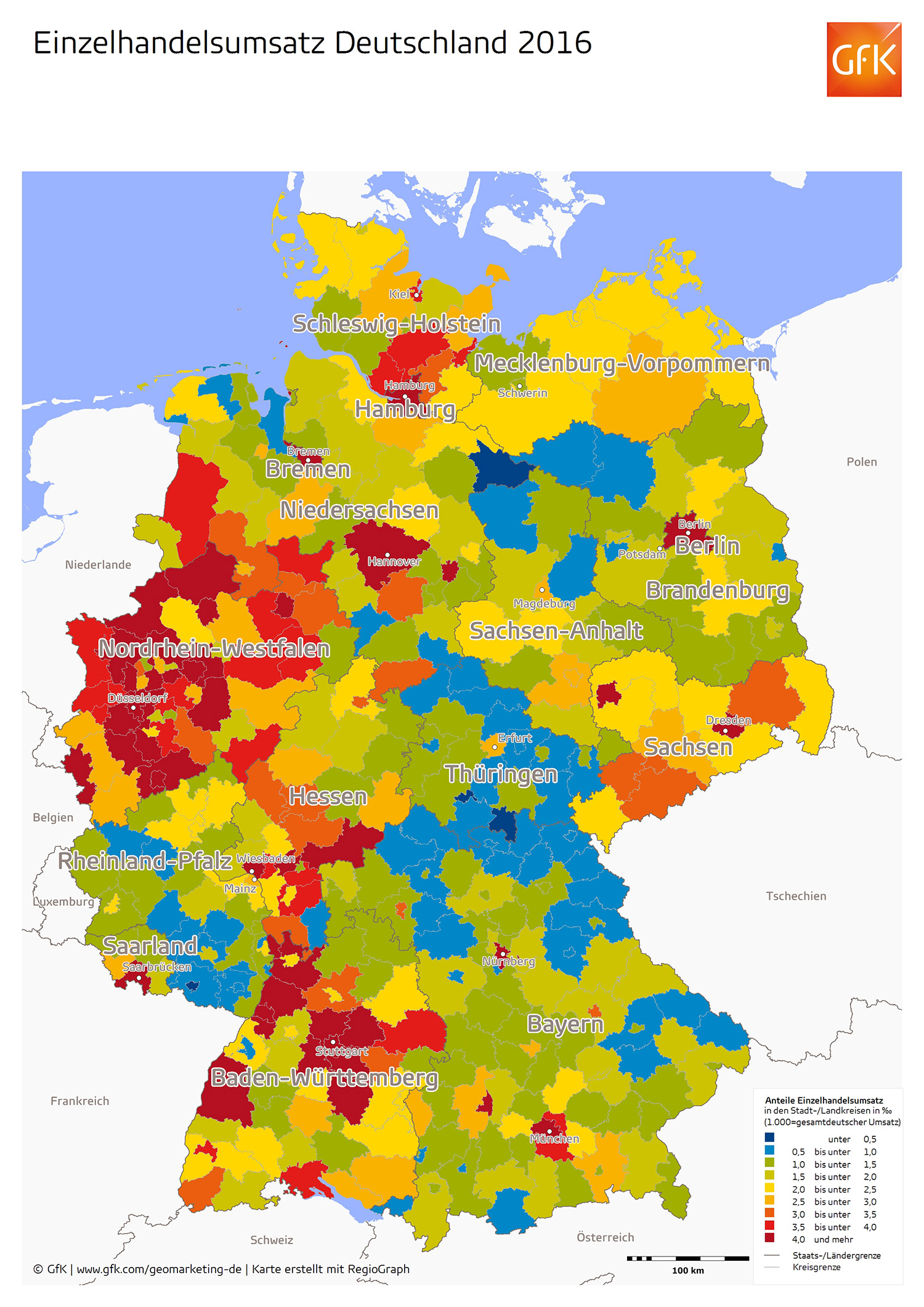 | Quelle: GfK Einzelhandelsumsatz Deutschland 2016; SK = Stadtkreis; LK = Landkreis | ||||