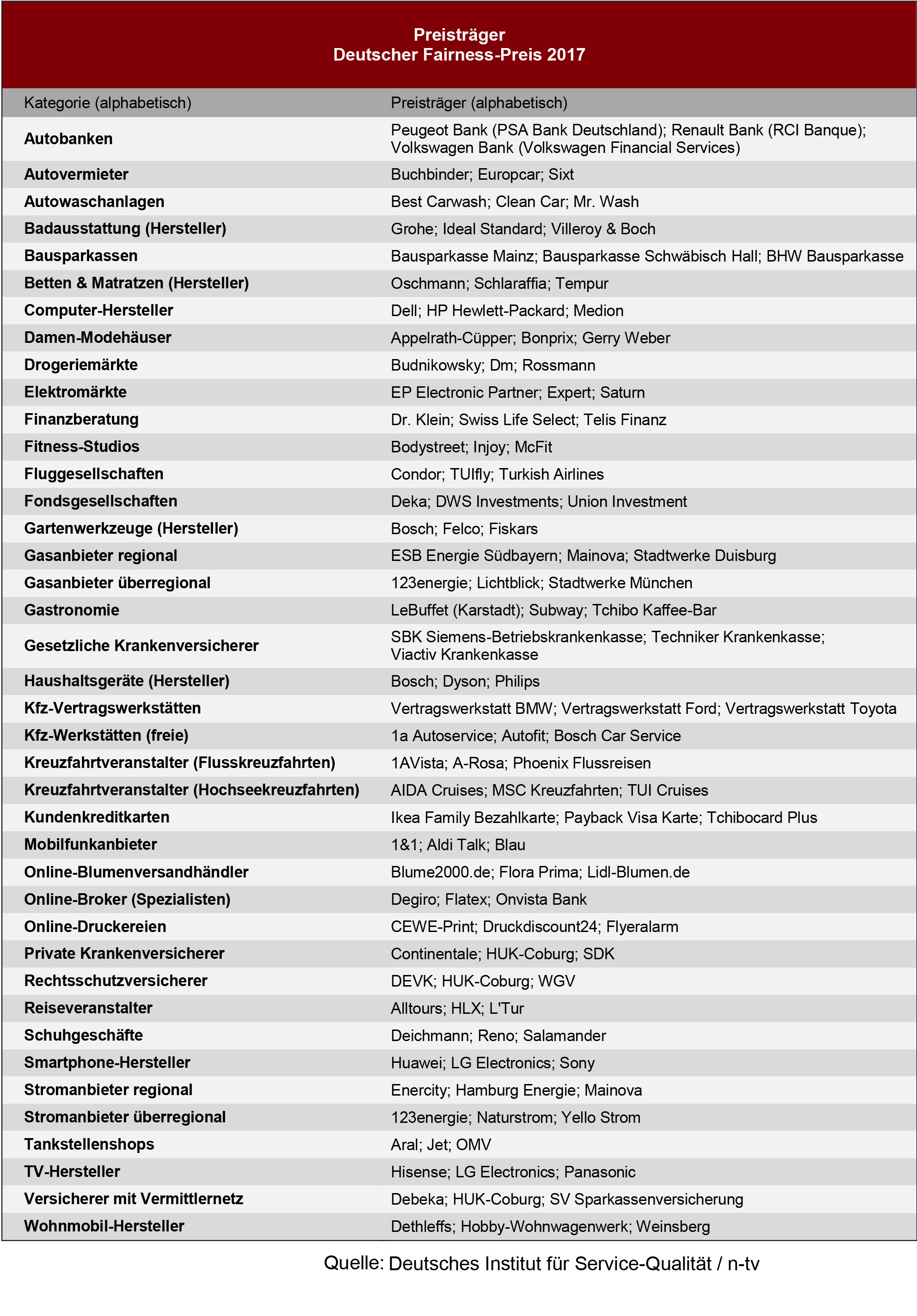 Ausgezeichnet wurden Unternehmen, die sich gegenüber dem Verbraucher besonders fair verhalten und in ihrer Branche Maßstäbe setzen. „Abseits von Marketingkampagnen und Werbeversprechen entscheiden hier zehntausende Kunden aus ihren persönlichen Erfahrungen heraus, welche Unternehmen führend sind. Das sorgt für Transparenz in zahlreichen Branchen. Der deutsche Fairness-Preis ist somit auch eine Auszeichnung vom Verbraucher für den Verbraucher“, so Hans Demmel, Geschäftsführer von n-tv.