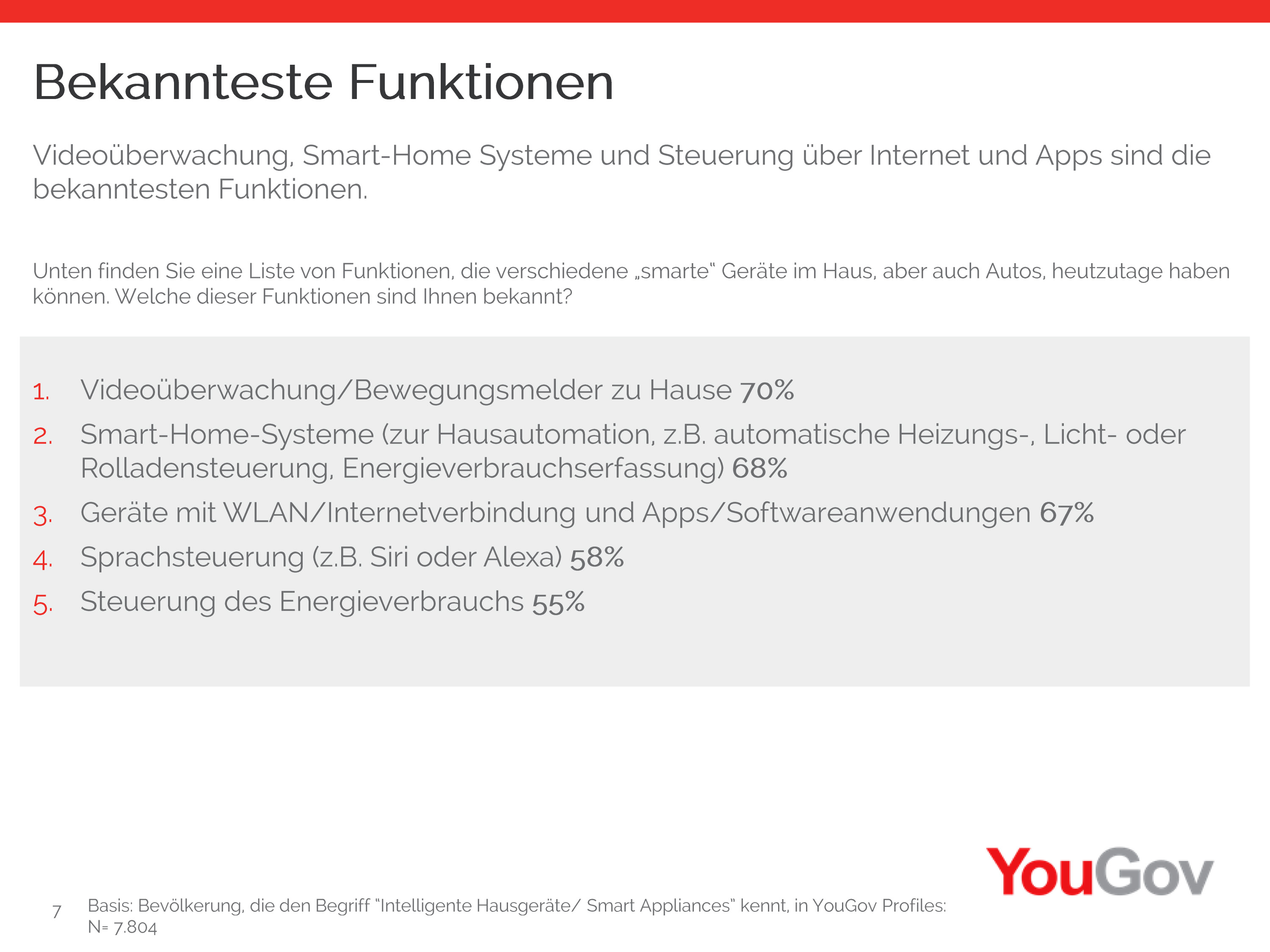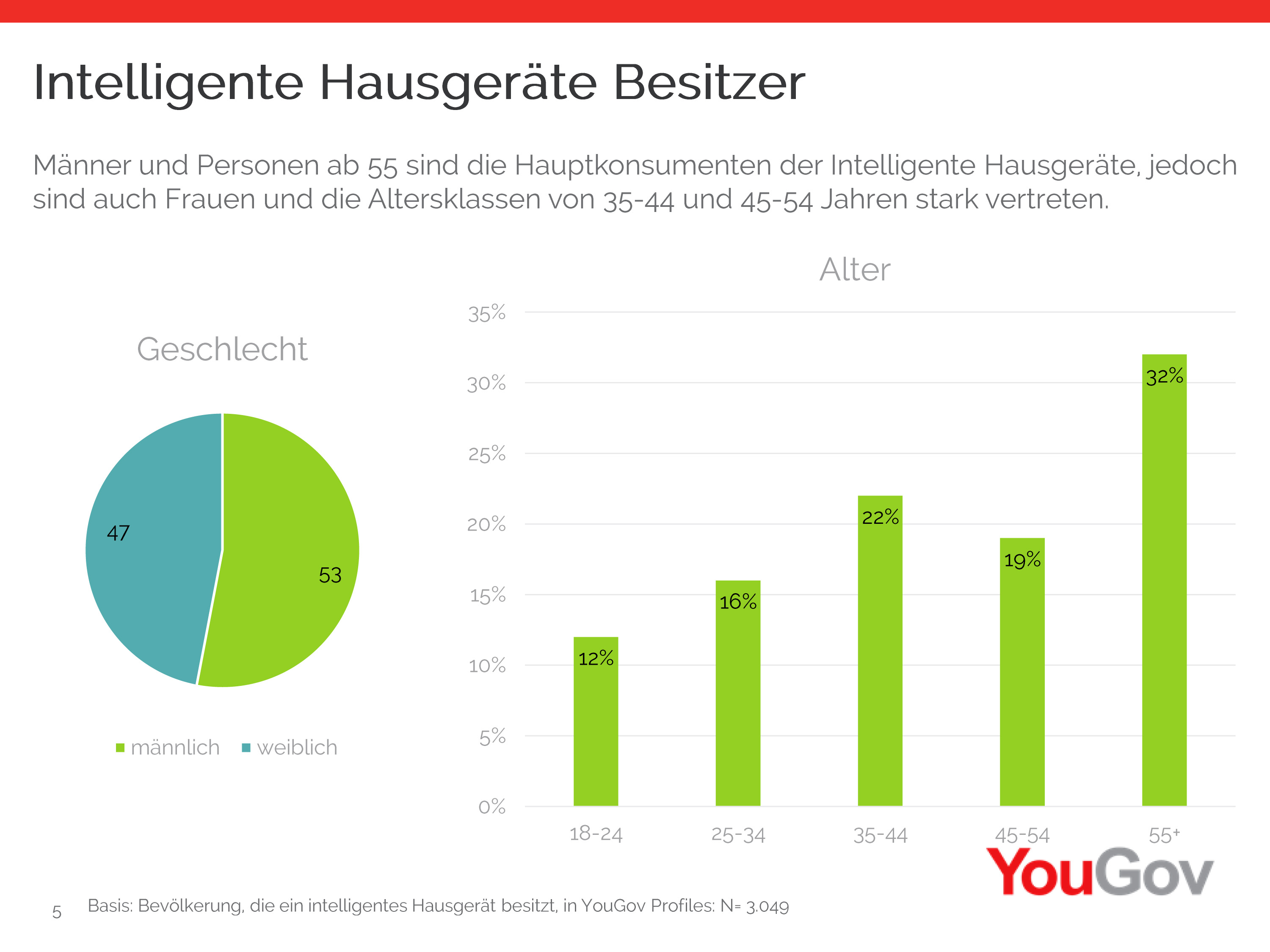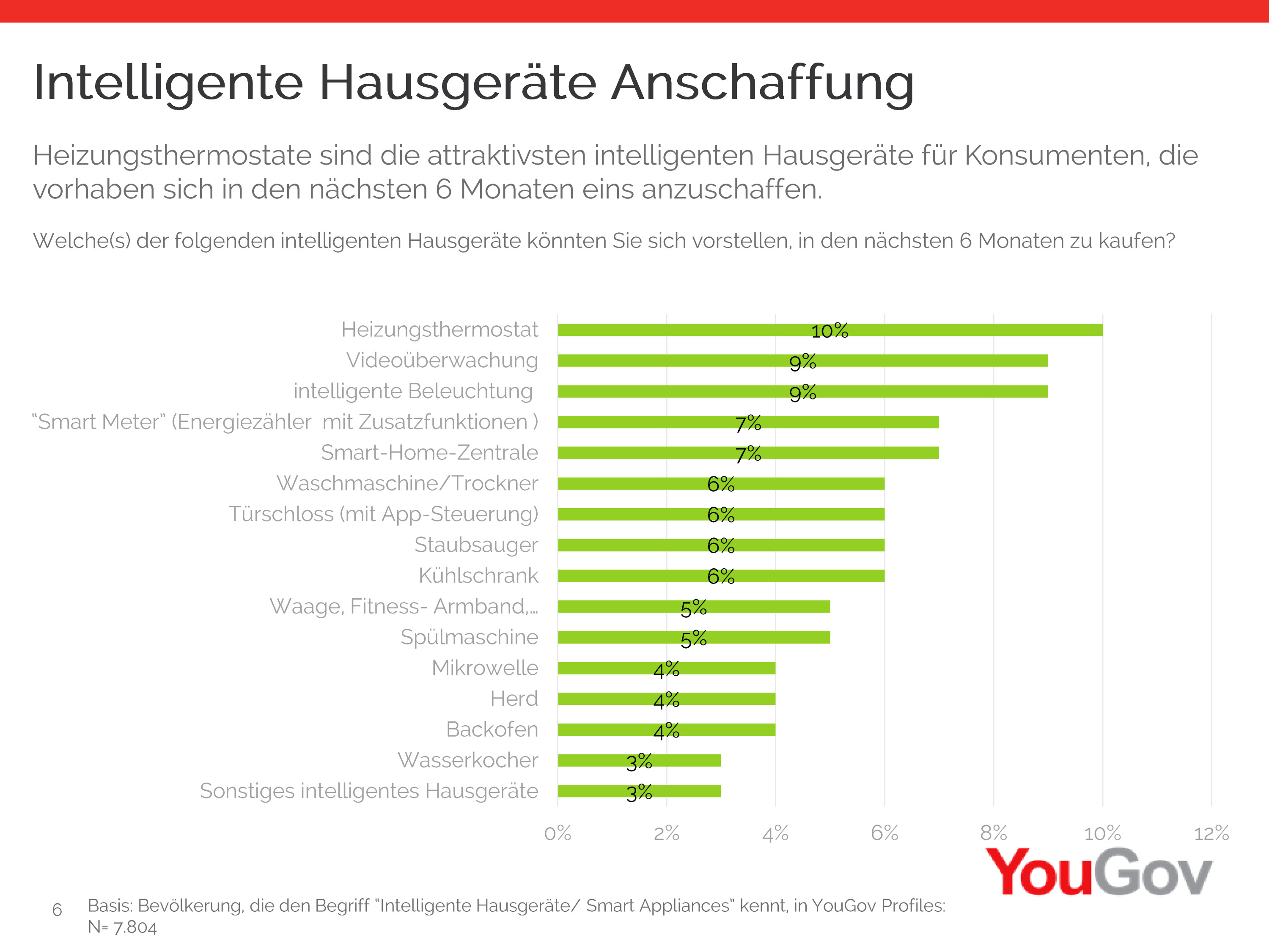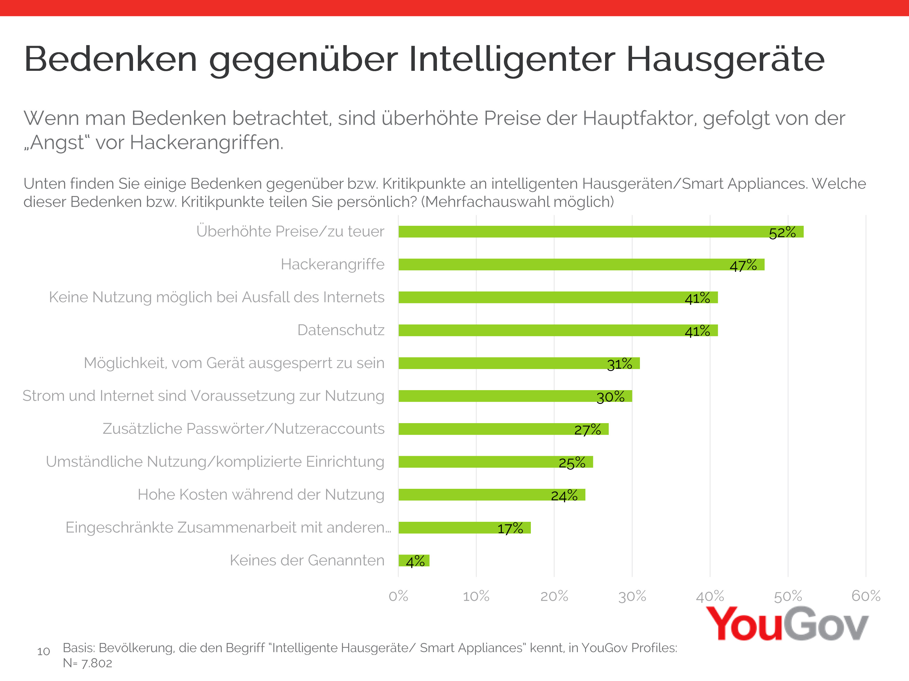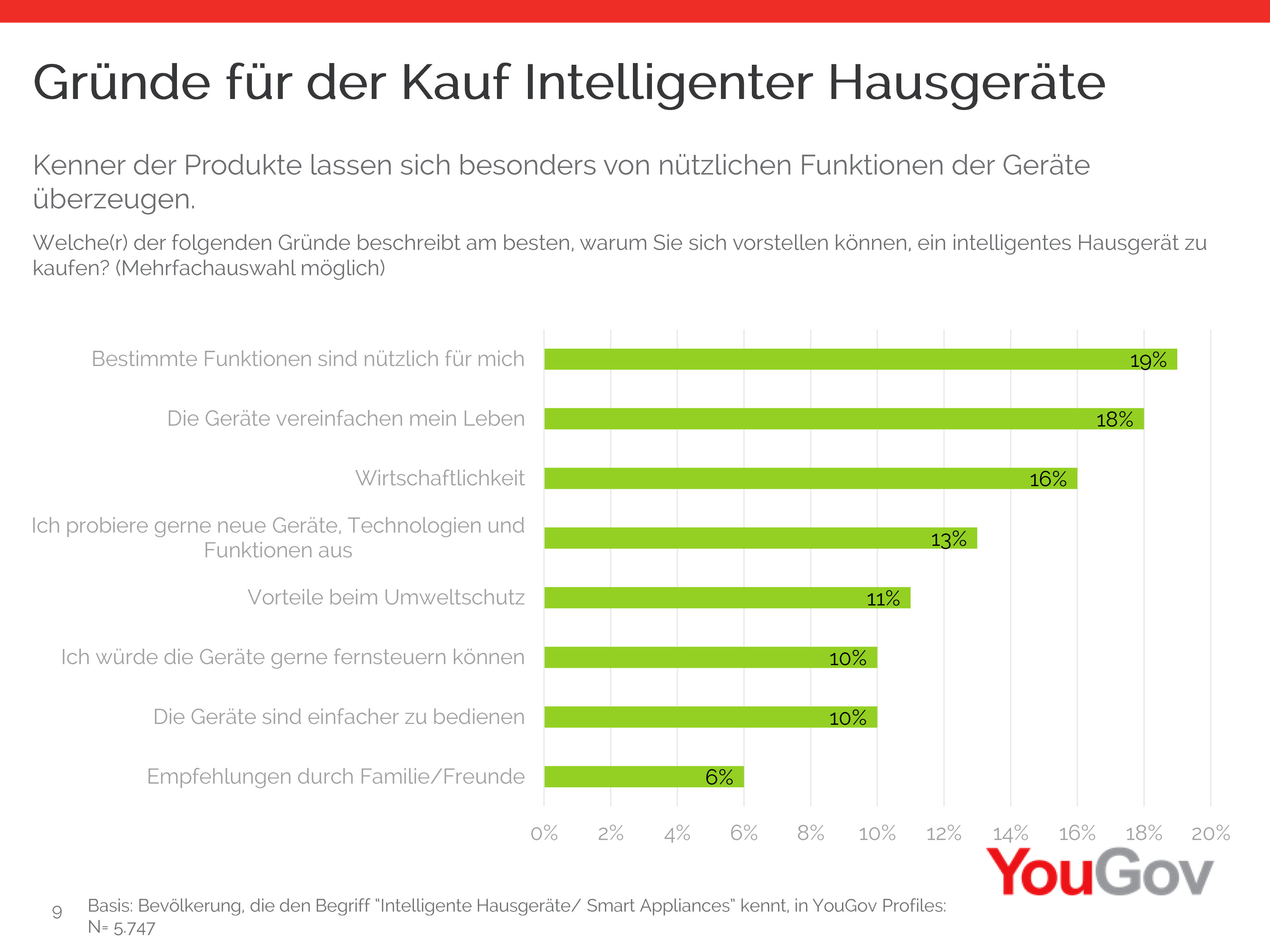 Einen ersten Blick auf die Zielgruppe deutscher Smart-Appliances-Nutzer vermittelt die YouGov Analyse „Smart Home“. Diese zeigt unter anderem auf, welche Gründe für oder gegen die Anschaffung smarter Hausgeräte sprechen. An dieser Stelle eine Zusammenfassung der wichtigsten Ergebnisse in Form von fünf Charts: