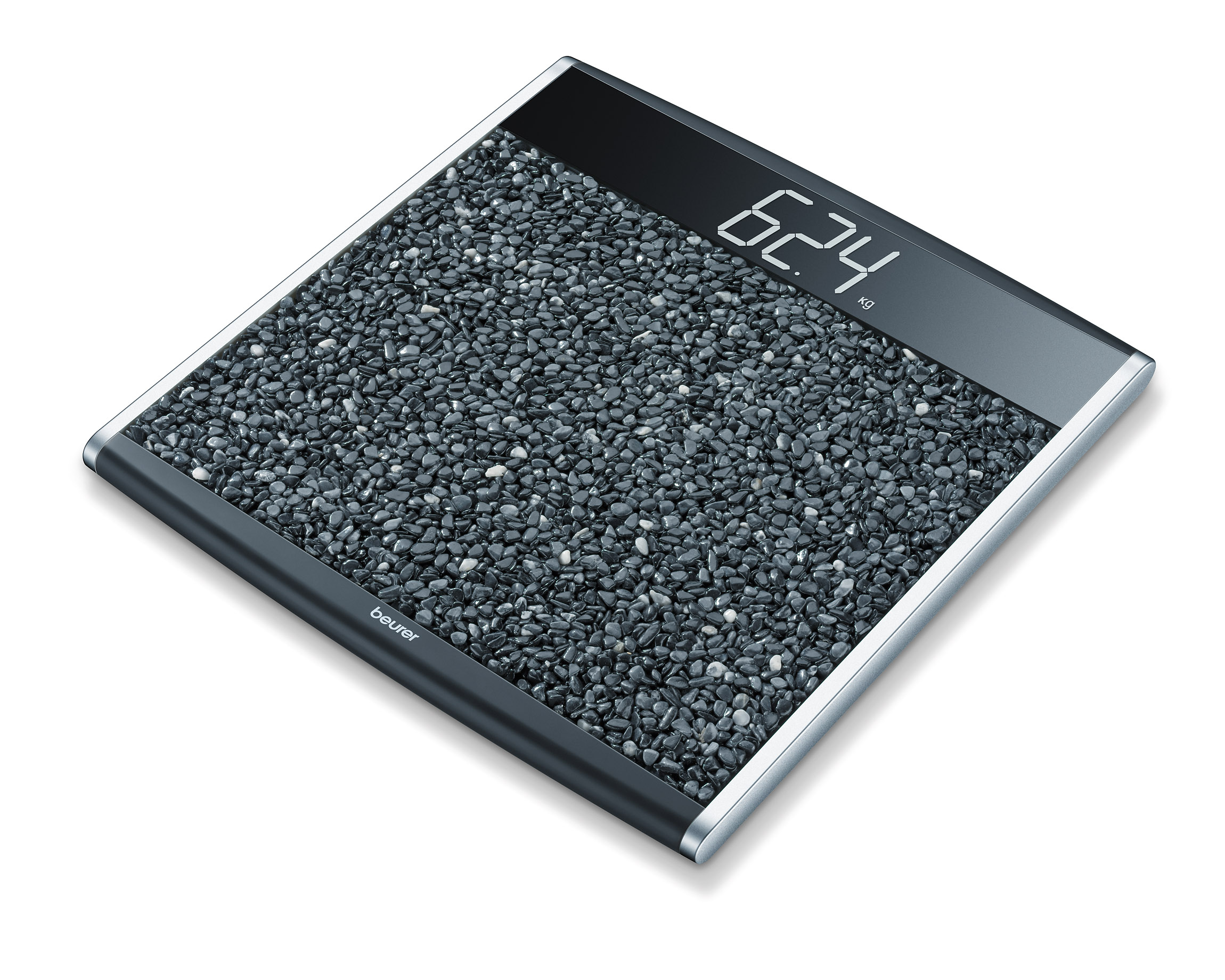 Die Beurer PS890 Personenwaage ist für alle gedacht, die sich etwas ganz Besonders gönnen möchten, eine Naturkieselwaage, die in jedem Badezimmer zum Unikat wird. Denn die dunklen Steine sind auf allen Exemplaren der PS 890 individuell angeordnet und auch selbst immer verschieden. So versprüht die 31 x 32 cm große XL-Trittfläche ein Flair von Natürlichkeit und bietet beim Wiegen zudem eine angenehme Fußmassage.