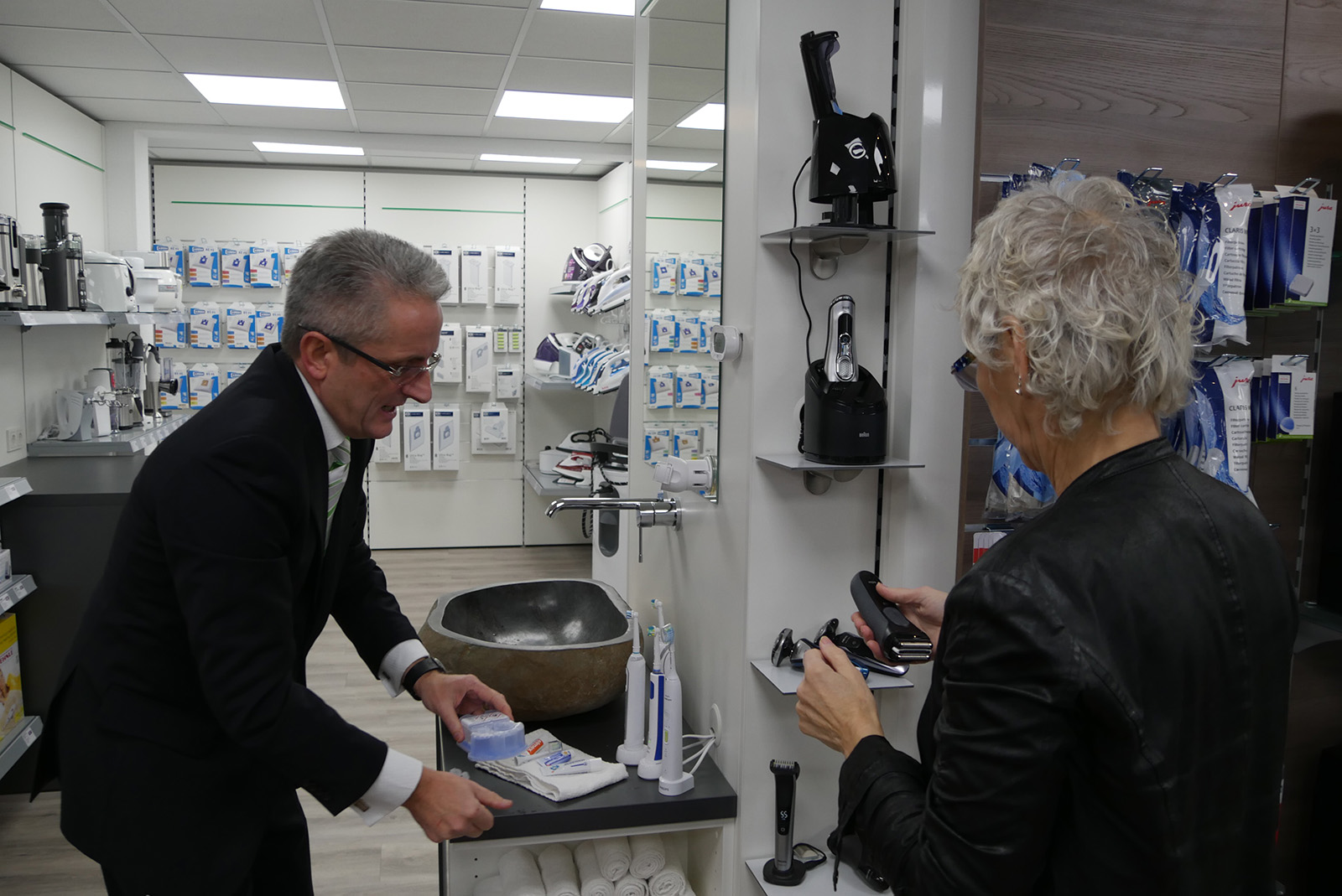 Ja, ganz genau, Zahnbürste. Ein ziemlich stylisher Waschtisch gibt die Möglichkeit, nicht nur elektrische Zahnbürsten, sondern auch Rasierer und Styling-Produkte direkt im Geschäft auszuprobieren. Müller: „Wir haben 15 Erlebnisinseln geschaffen, damit unsere Kunden mit allen Sinnen – also Riechen, Hören, Schmecken, Sehen und Tasten – ausprobieren und einkaufen können.“
