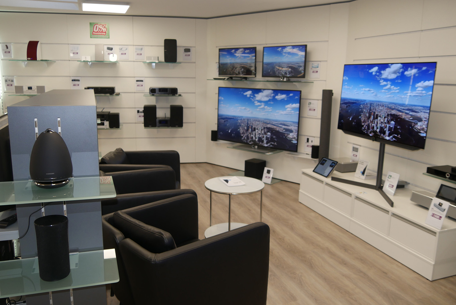 „Wir sind in allen Warengruppen am Puls der Zeit“, erklärt Klaus-Dieter Müller. So auch bei den TV-Geräten, die jetzt, egal ob 4K-Technologie, OLED-Fernseher oder Curved-Monitore – wie in einer Arena gezeigt werden, so dass die Kunden in der umfangreiche Ausstellung (vor allem Loewe, Panasonic und Samsung) die unterschiedlichen Modelle direkt vergleichen können.