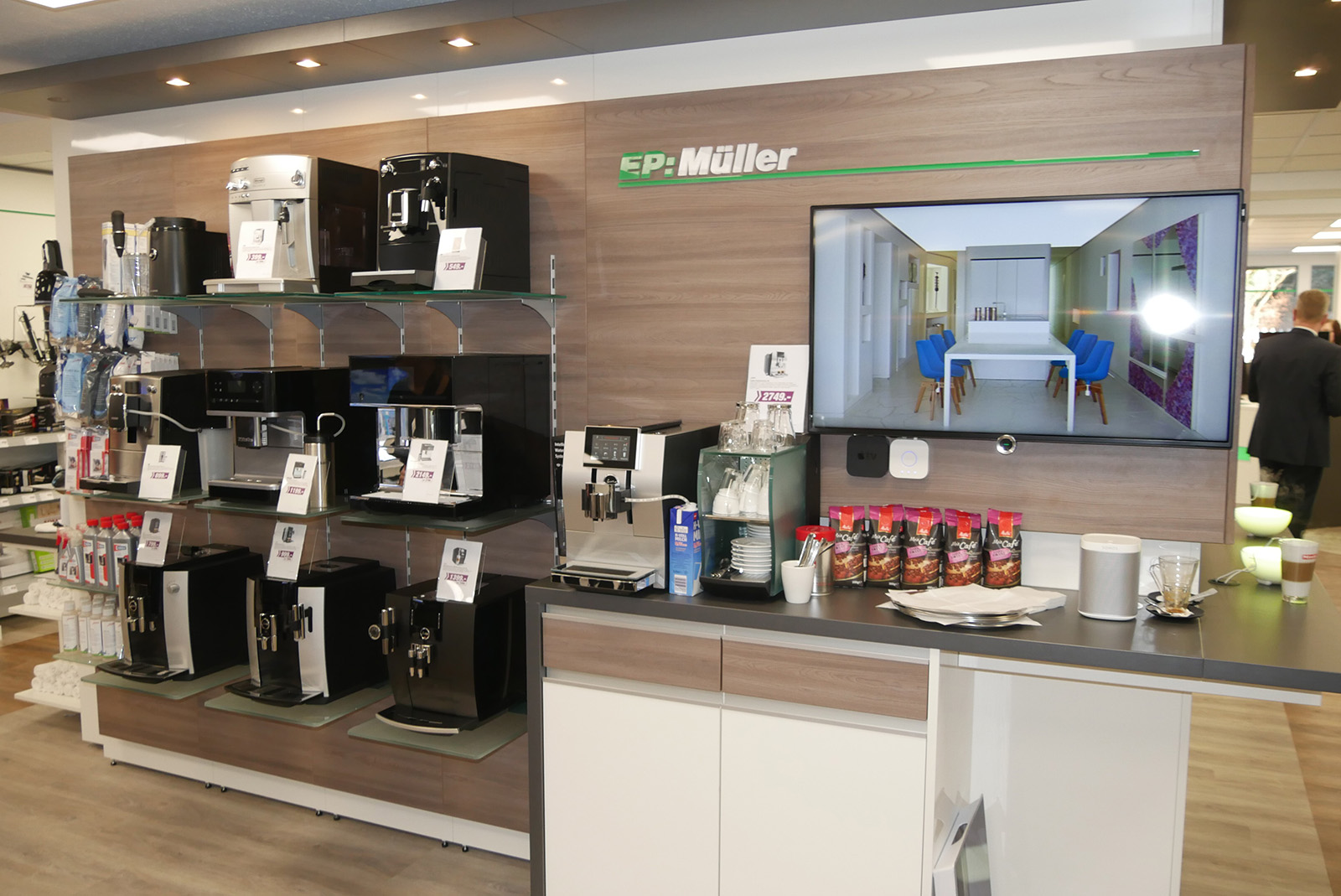 Auf 300 Quadratmetern präsentiert das 15-köpfige Müller-Team jetzt Produkte und Lösungen aus den Bereichen Unterhaltungs- und Haushaltselektronik, IT/Multimedia, Telekommunikation und neuerdings auch Sicherheitstechnik. Über allem stand der Wunsch, die Geräte zu inszenieren, sie erlebbar zu machen, egal ob TV, Telekommunikation, Kühlschrank, Kaffee-Vollautomat oder Zahnbürste. Zahnbürste?