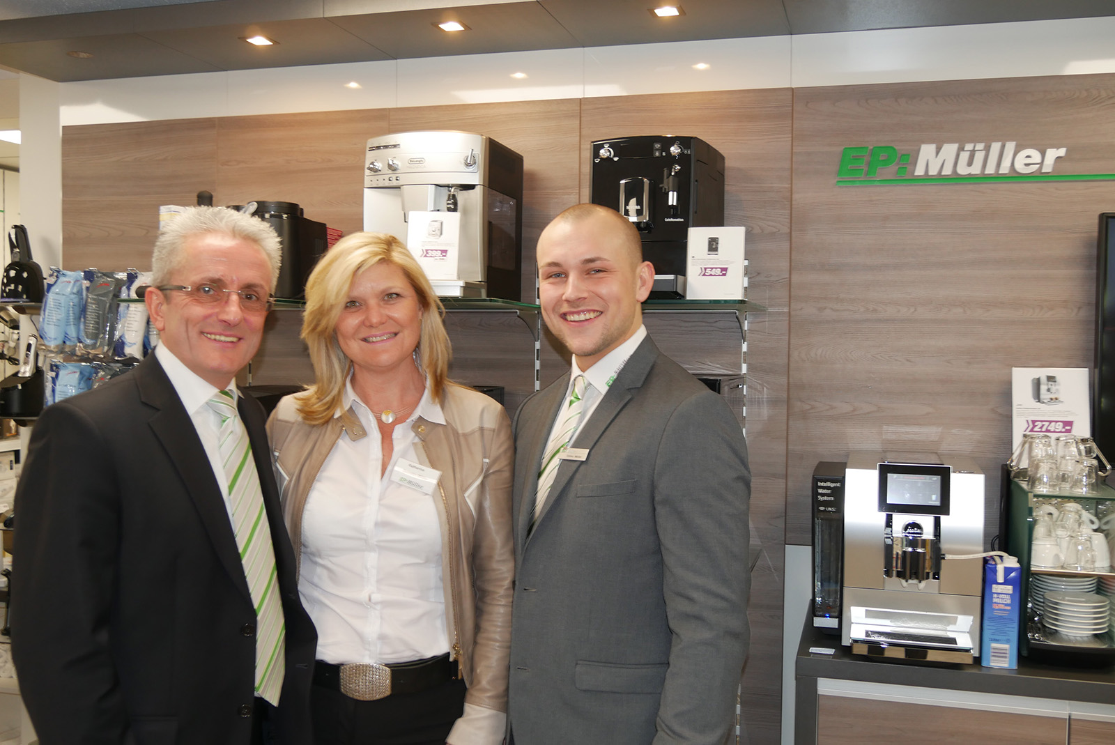 Was uns im Vergleich zum Vorjahr auffällt: Das Sortiment, mit dessen Ausgestaltung erstmals Junior-Chef Tobias Müller eine deutliche Duftmarke setzt, ist in puncto Wertigkeit im Rahmen der EP: Qualitätsoffensive noch einmal um eine kleine, aber spürbare Nuance nach oben gedreht worden, insbesondere im TV-Segment mit „spannensicheren Qualitätsprodukten“. Bei der Weißen Ware geben im Großgerätebereich Miele, Liebherr und Siemens den Ton an, beim Kaffee Jura und Nivona sowie bei den Kleingeräten Philips und Procter & Gamble.