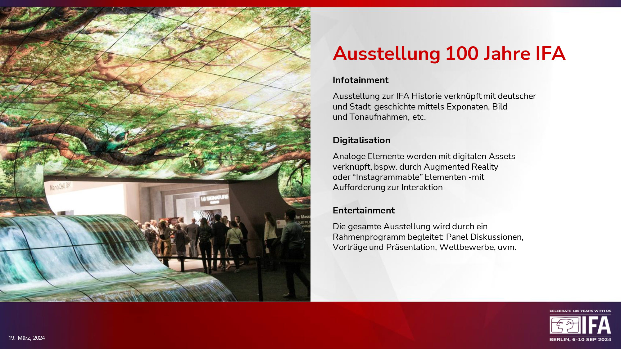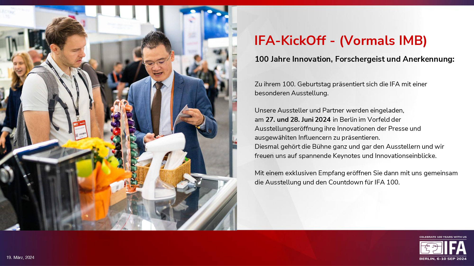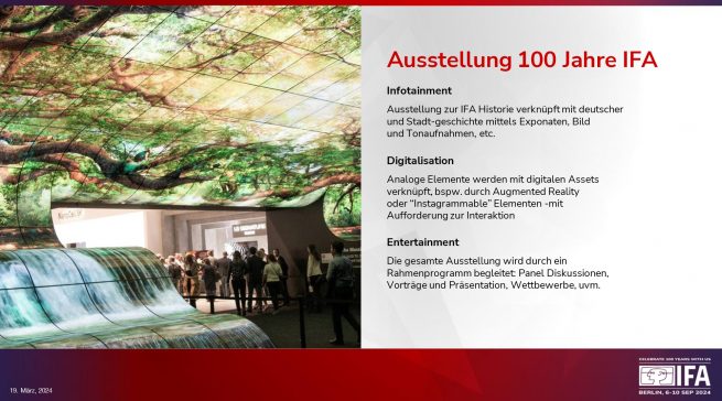 Dazu passt auch: Zur IFA100 Opening Gala, eine Nacht des Feierns, um an ein Jahrhundert IFA als wichtiger internationaler Player zu erinnern, wird, neben Prominenz aus Musik, Sport und Wirtschaft auf dem Roten Teppich auch der Bundeskanzler als Ehrengast erwartet.