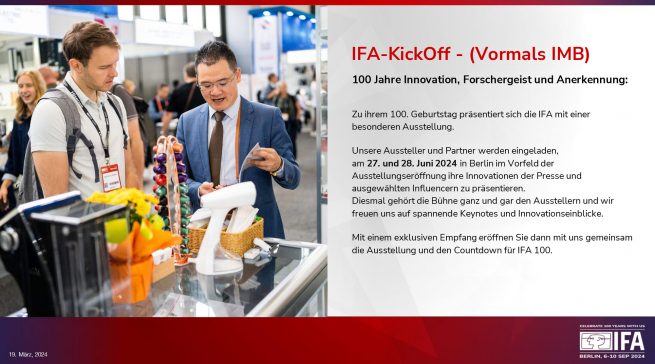Lindner weiter: „Unser Ziel ist es, das Bewusstsein rund um das IFA100-Jubiläum zu schärfen und die Neupositionierung der IFA zu stärken. Wir werden neue Zielgruppen durch spannende und inspirierende Aktivierungen und Inhalte erschließen, und dafür mit relevanten Medien (u.a. Verlagsgruppe Handelsblatt) und Influencern zusammenarbeiten, um eine nachhaltige Community aufzubauen.“