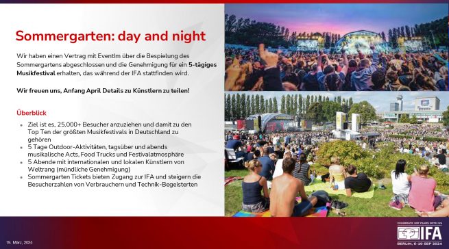 „Ganz Berlin wird den Puls der IFA spüren und in Vorfreude versetzt“, freut sich Leif Lindner. „Nicht nur die Rückkehr des Sommergarten als großes Musik- und Unterhaltungsprogramm mit Festival-Charakter an fünf Tagen verspricht einzigartige Erlebnisse. Das neue Format 100Moments schafft Momente und bleibende Erinnerungen für alle Besucherinnen und Besucher der Hauptstadt und das bereits genau ab 100 Tagen vor der Jubiläumsmesse.“
